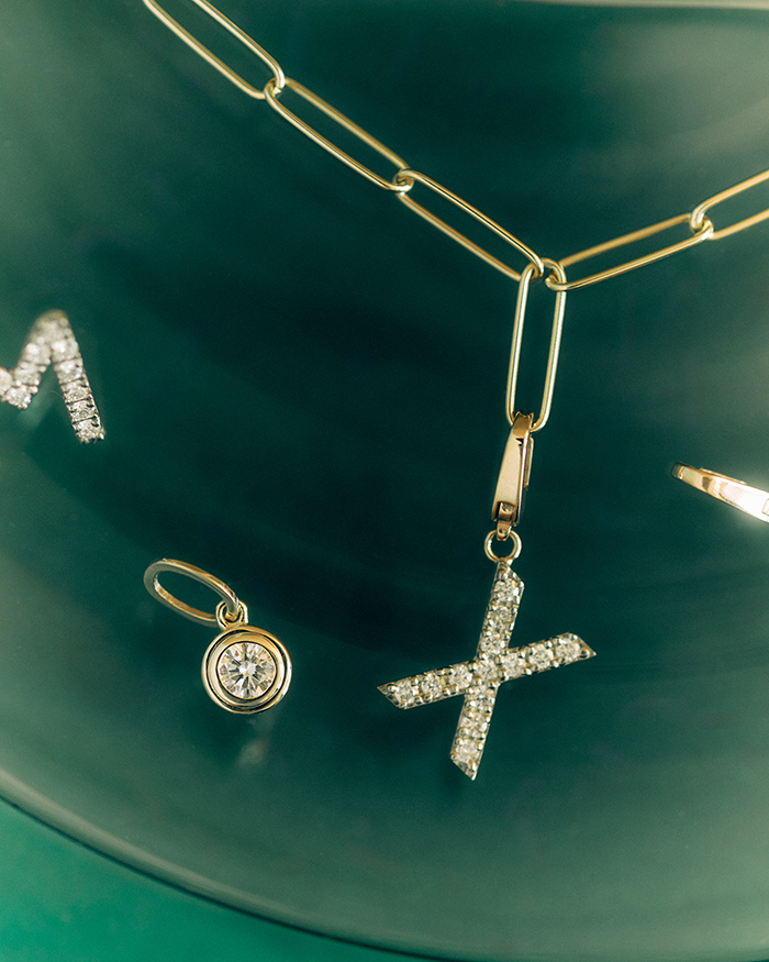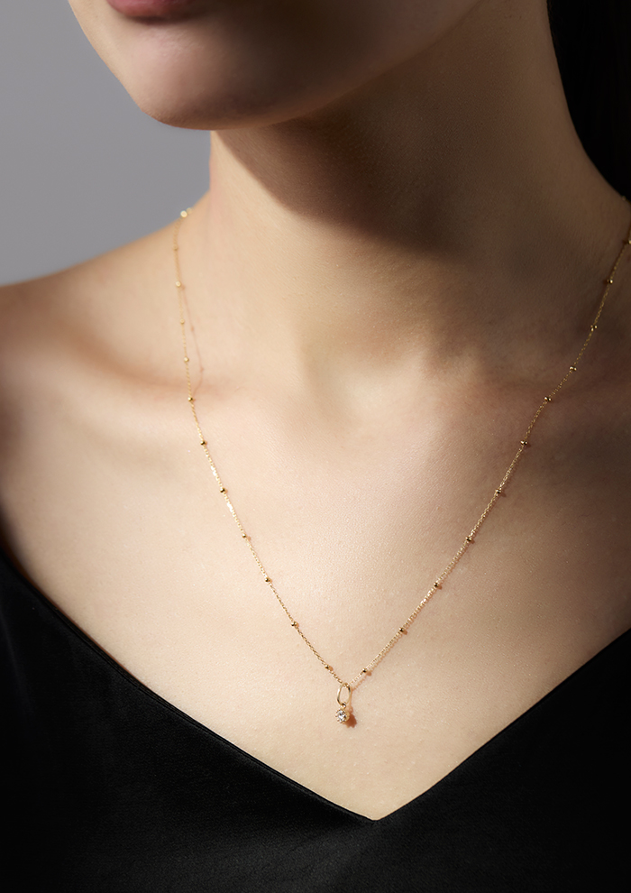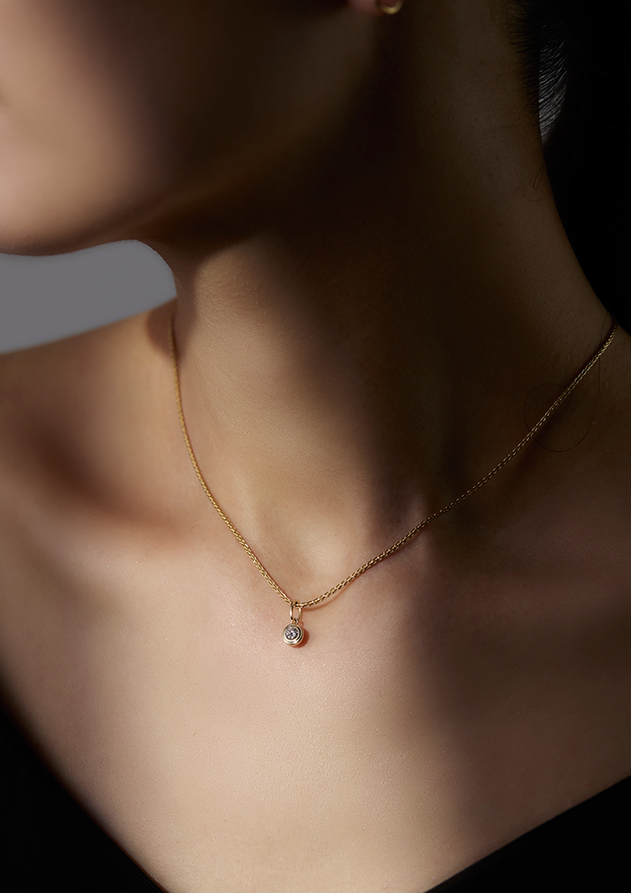 「こちらは、ひと粒の天然ダイヤをすっきりと閉じ込めたミニマルなチャーム。ベーシックだからこそ際立つ、タイムレスな美しさと澄んだ光が魅力です。地金をたっぷり使ったミニマルリッチなエンサークルチャームと、軽やかさと繊細さの中に芯のある光を放つスパークチャーム。ホリデーシーズンの“自分へのご褒美”にもおすすめ」。