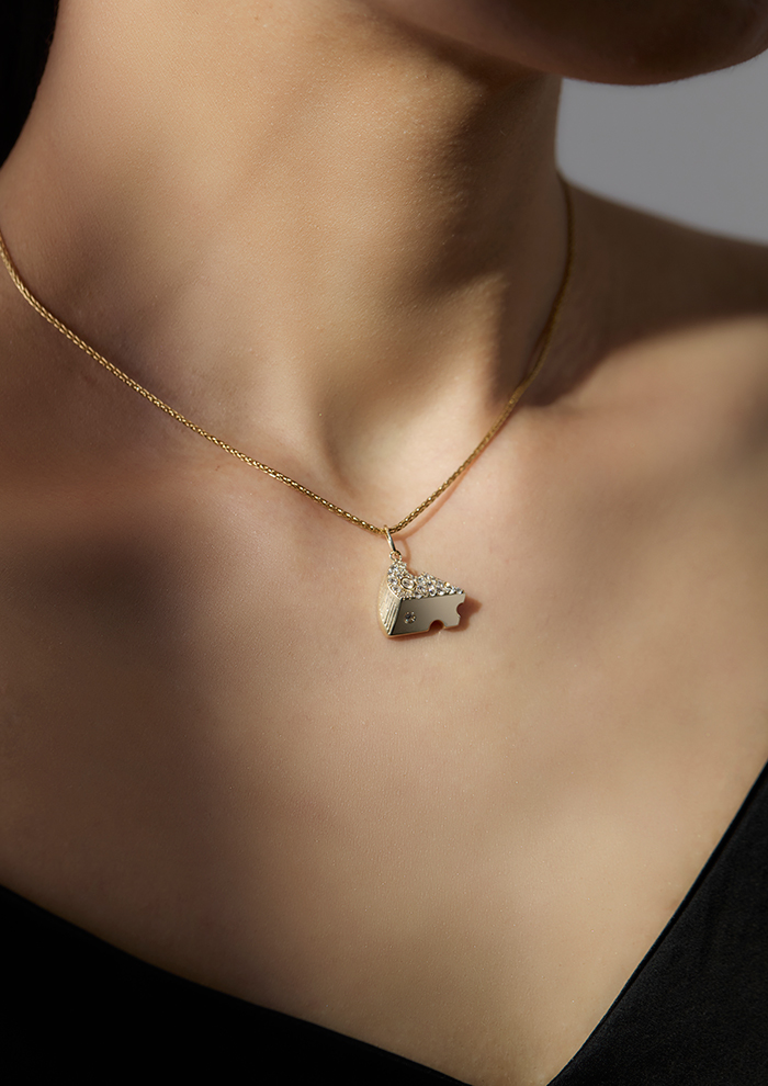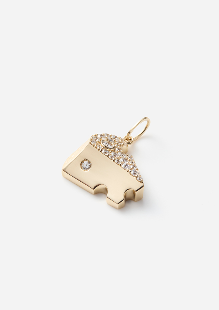 「軽やかなユーモアをのせた小さな“遊び心”。なめらかな断面に輝くひと粒のきらめきと、ぎゅっと敷き詰めたパヴェダイヤモンドによって1ピースのチーズを表現したチャームです」。