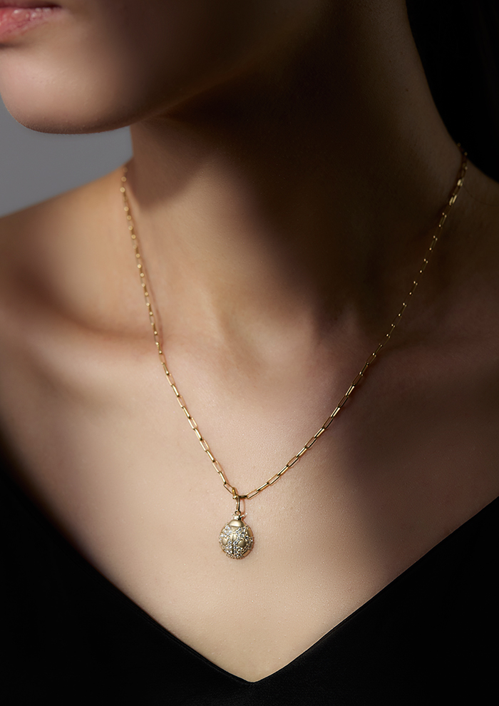 「幸せの象徴として知られる“てんとう虫”をモチーフにしたチャーム。ころんとした丸い立体的なフォルムにダイヤモンドを散りばめ、マットな質感の斑点でコントラストを出した愛らしい一点です。丸みのあるデザインが、意外なほど大人のスタイルになじみます」。