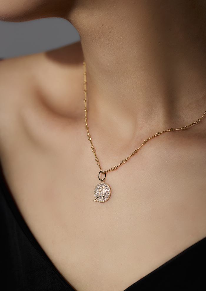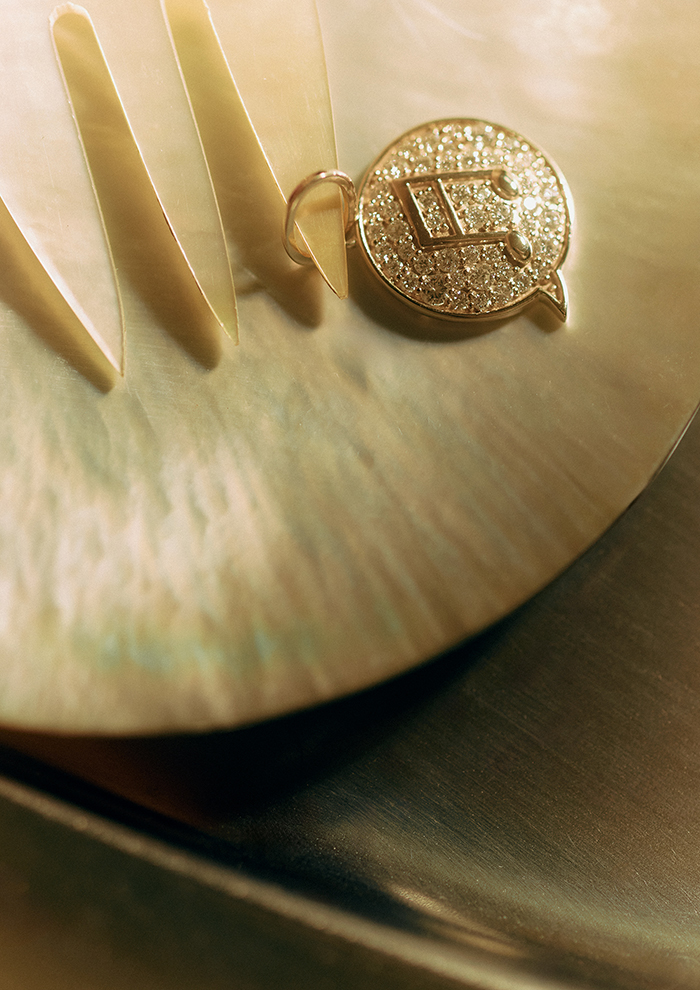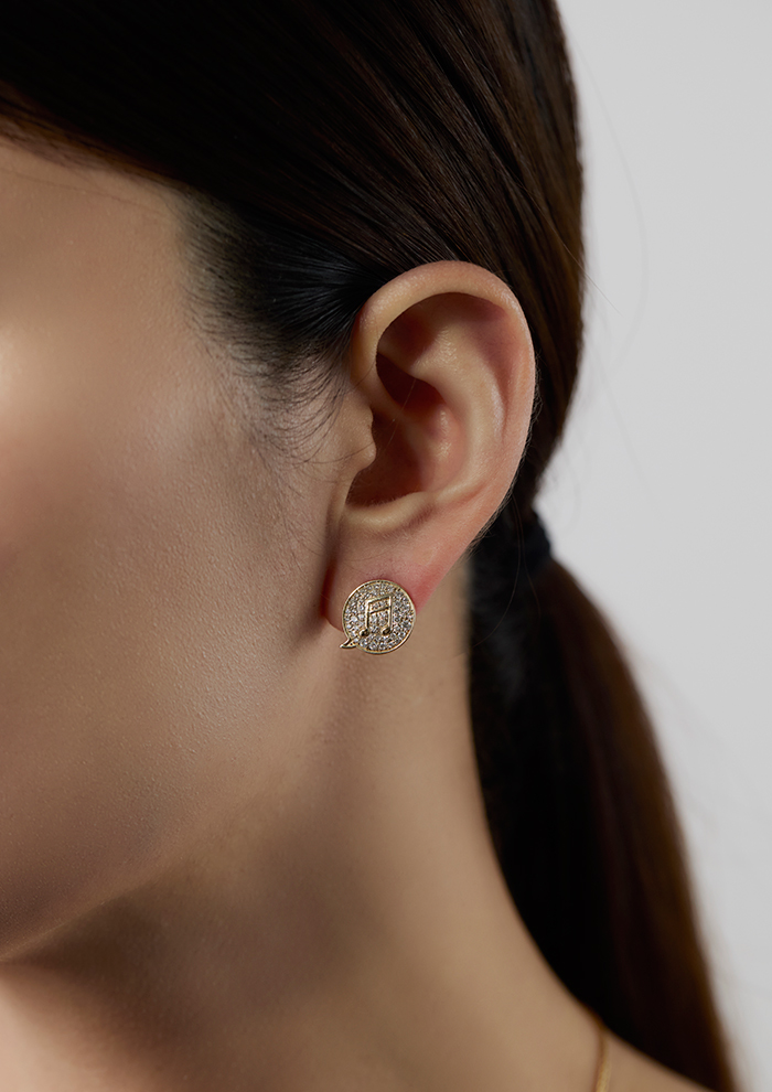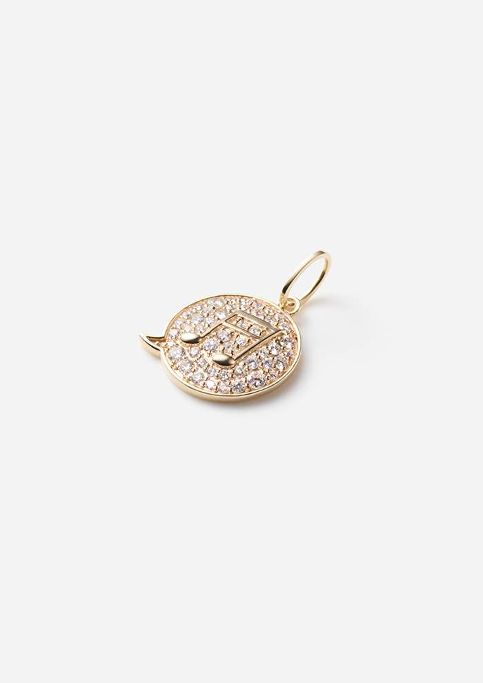 「パヴェダイヤモンドを敷き詰めたぷっくりシルエットの吹き出しモチーフに、ゴールドの音符を描いたダイヤモンドチャーム。ひとつで主役に、重ねづけでプレイフルなスタイルに」。
