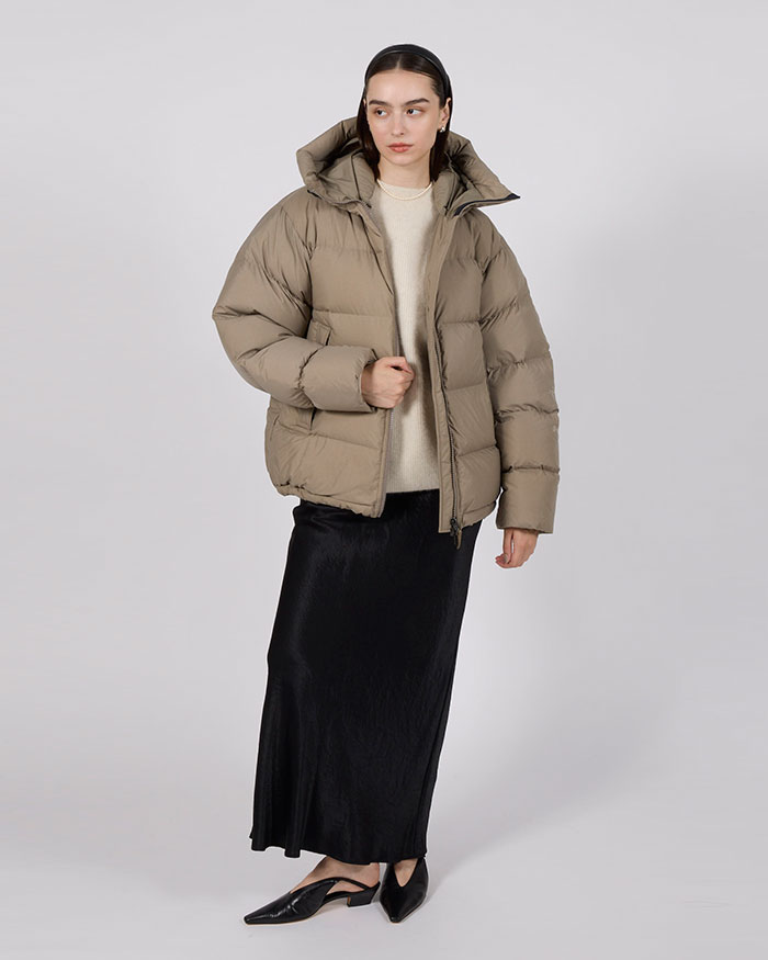 「驚くほど超軽量でシンプルなスタンドカラーのダウンジャケット。中のダウンが透けて見えるほどの軽量薄手タイプながら、引き裂き強度に優れたリサイクルナイロン素材を使用しています。インナーには複数のインサイドポケットを配しており、収納力も抜群! こちらもミリタリーのディテールである前振りの袖、腕の可動域を広げられるアクションプリーツがポイントです」。