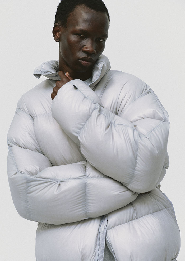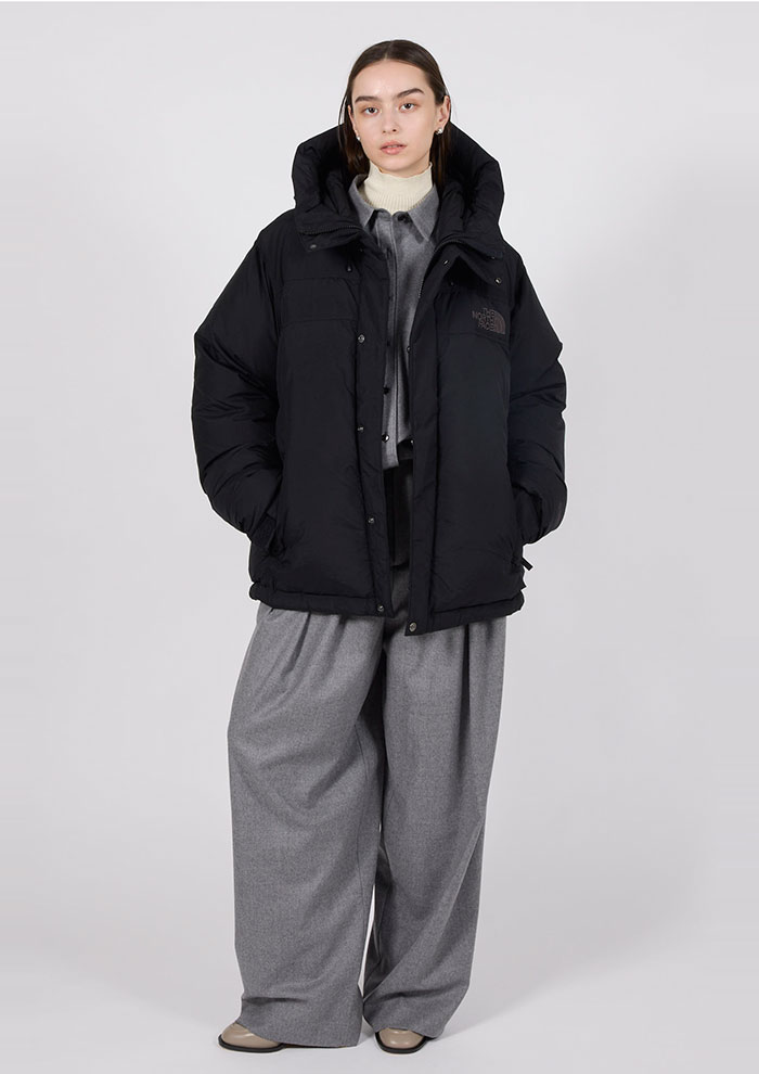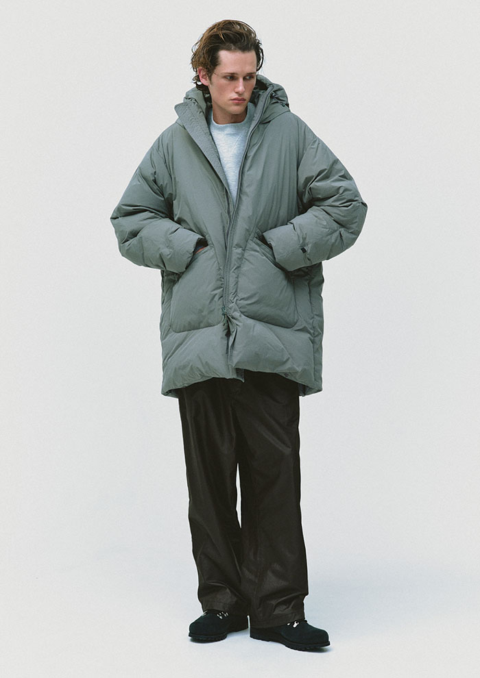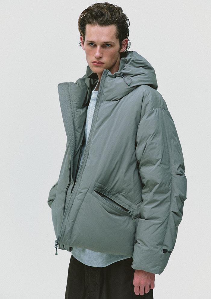 「こちらは前出と同シリーズのオルタレーションパフズジャケット。中綿の一部にリサイクルダウンを使用し、軽さとしっかりしたバッフル感を兼ね備えています。フロントは防風性の高いダブルフラップ仕様。ダウンをたっぷり封入した大きめフードは頭部をしっかり覆えて、ドローコードでフィット感の調節も可能です」。