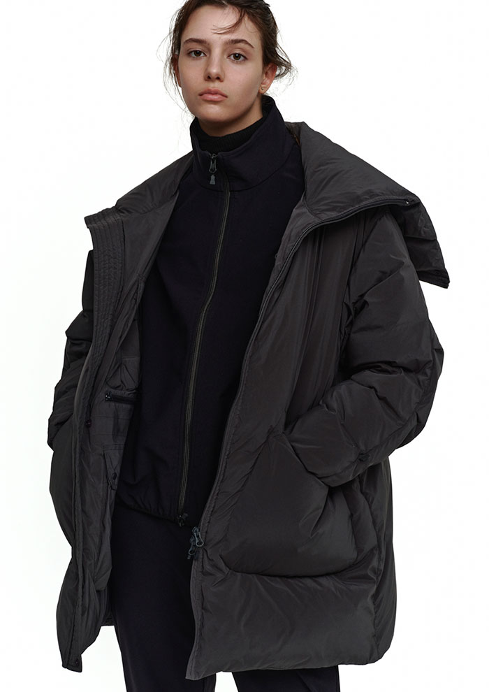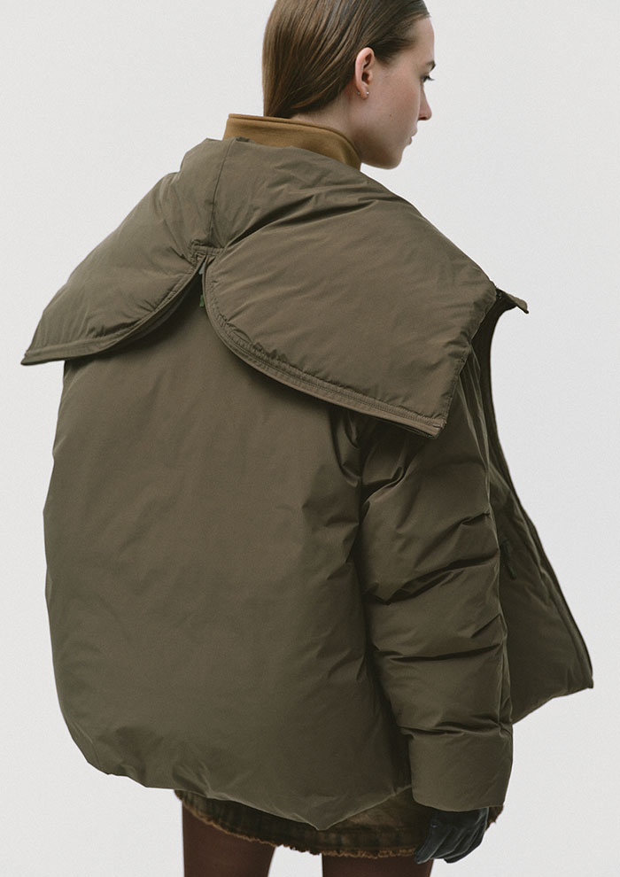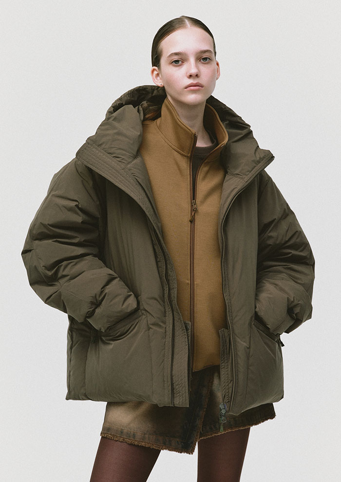 「アメリカ軍のカデットパーカをデザインソースにしたダウンジャケットは、着丈をショート丈とロング丈にアレンジできる2WAY仕様。フードはジッパーを開けるとセーラー風になります。開いたフードの先端をドットボタンで留めると、立ち襟のデザインに。また内側には大小さまざまなポケットワークを施し、見た目以上の収納力も備えています。ミリタリーのディテールである前振りの袖がアクセント。アクションプリーツを加え、腕の可動域を広げられるように考えられています」。