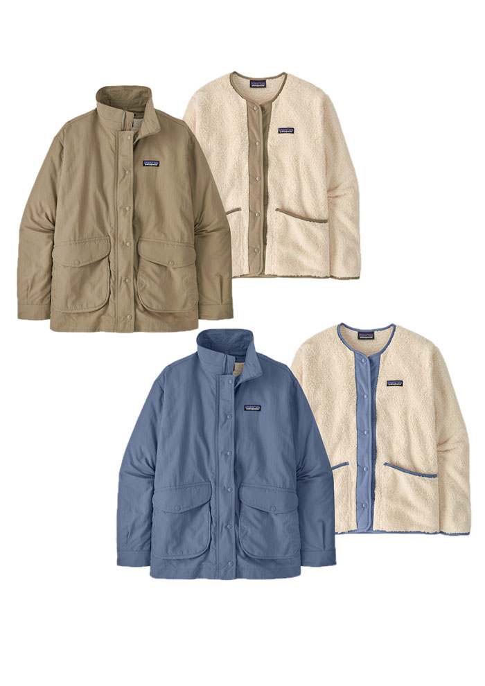 「こちらは、外側の軽量なシェルと内側の快適なフリースをそれぞれ単独でも、組み合わせても着用可能なスリーインワンコート。すべてのマテリアルにリサイクル素材を100%使用しています。暖かいカーディガン風の内側ジャケットはスナップ留めでシェルに取り付け可能。シェルはリサイクルナイロン100%のエコニールのリップストップで、PFASを意図的に使用せずに製造されたDWR(耐久性撥水)加工済み。長いシーズンで重宝するおすすめアウターです」。