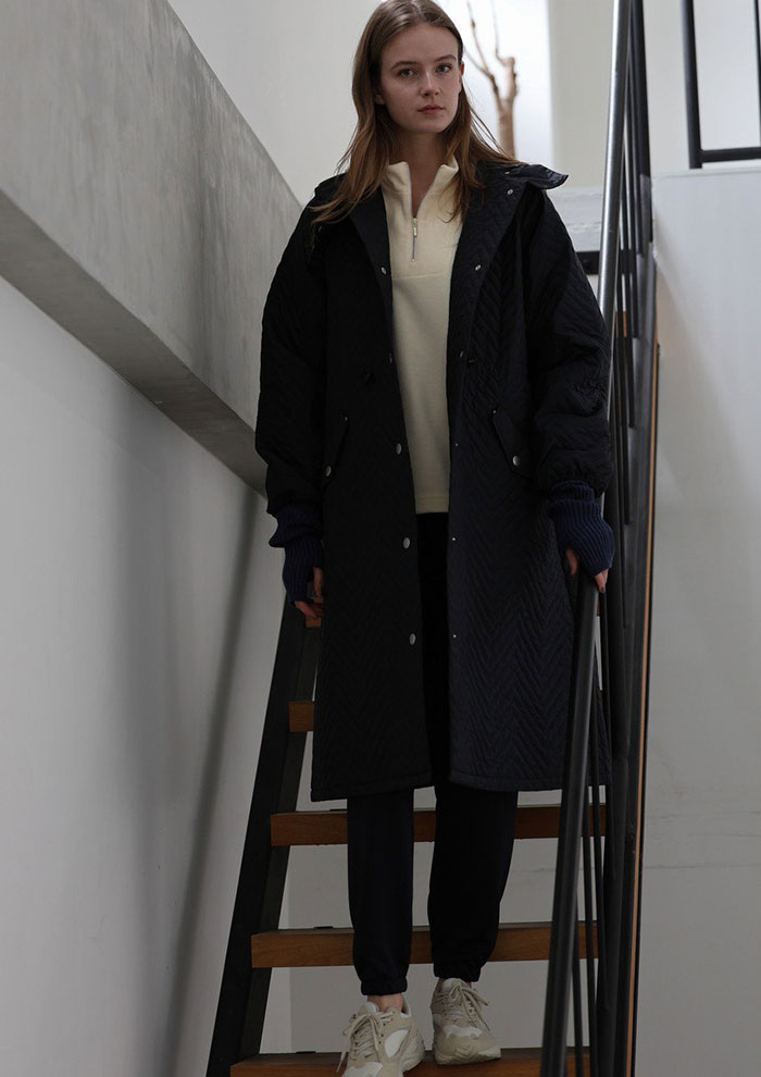 「シェブロン柄キルティングが存在感を放つロングコート。湿気の多い日でも蒸れにくく、圧縮性と回復性に優れた素材で、ダウンをも凌ぐ保温性を備えています。ゆったりと広がるAラインが女性らしい抜け感を演出。フードはジップ仕様で、セーラーカラーとしても使える2WAYデザイン。スタイルに変化をつけながら、季節の着こなしをエレガントにアップデートしてくれます」。