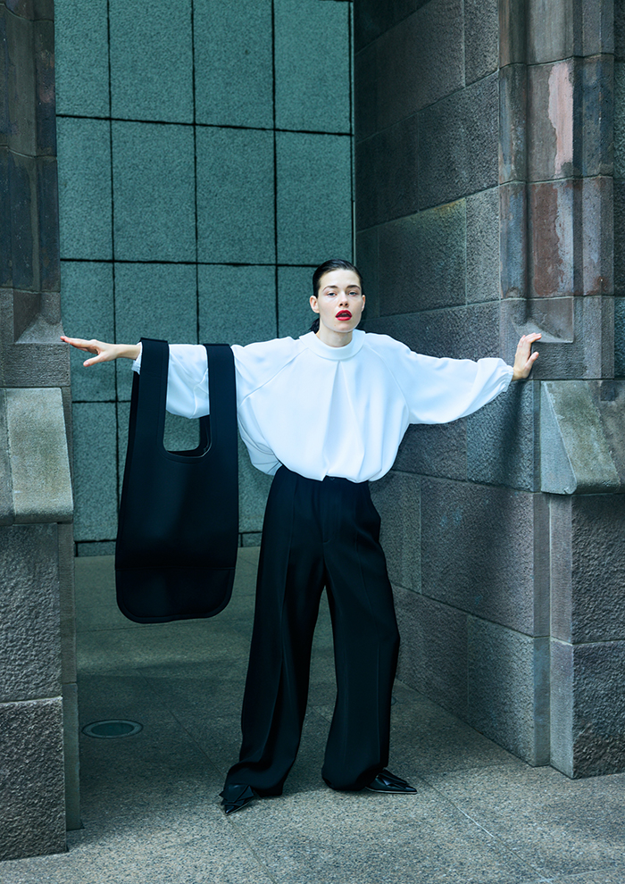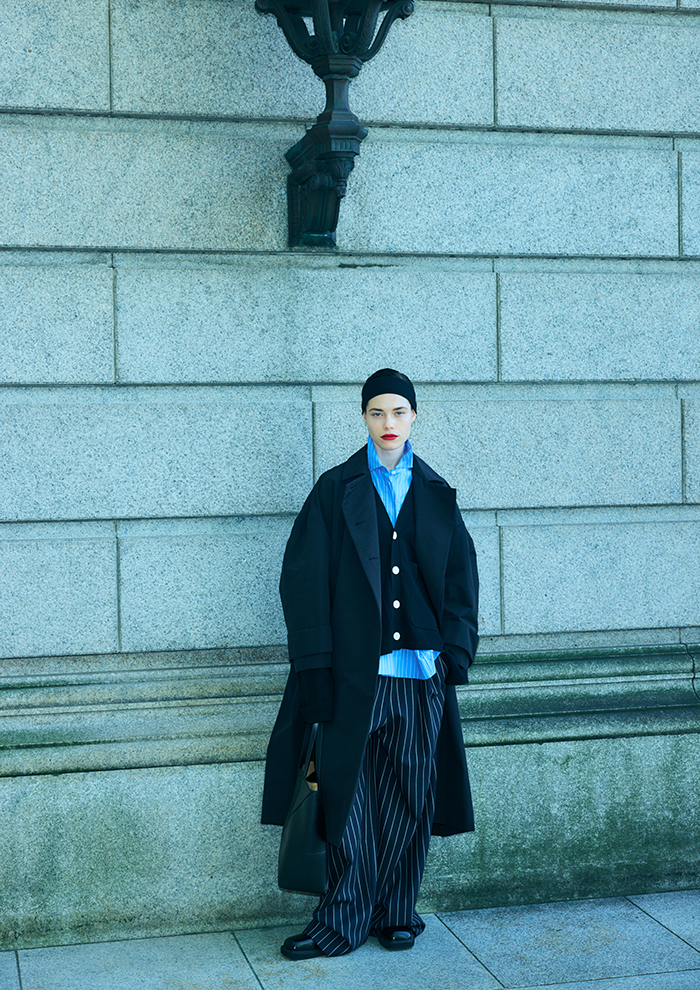 「フォーマルシーンに欠かせないジャケット。寒い時期は中にレイヤードしやすく、春先まで使える便利な一着に。ミニマルなデザインは、着まわし力も抜群です。シャツは、ヘチマを思わせるウエストシェイプから裾にかけての大胆なフレアが女性らしいポイント。ルーズシルエットのカーディガンが抜け感をプラスします。パンツには、スーツ地で仕立てた、定番人気のリラックスゴムワイドトラウザーを。形はそのままに、パンツの筒幅にさりげないゆとりを出し、ウエストフルゴム仕様の快適な着用感も魅力」。