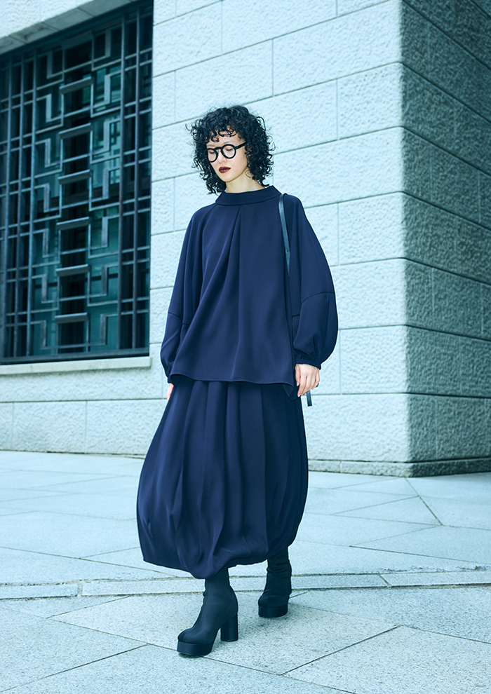 「シンプルなパンツやスカートとスタイリングするだけで、大人のエレガンスが楽しめるプルオーバー。素材の仕立て映えを考えたラグランスリーブや美しいドレープ、さりげなく首元を隠せるディテールなど、大人の女性に向けたデザインを随所に施しています。初夏まで着用できるプルオーバーになるよう、袖まくりがしやすいゴムの袖口もポイント。スカートは、バルーンのようなフォルムが魅力。丸みのあるプリーツスカートのバランスが新しく、フォーマルシーンに変化を与えてくれます。ウエストゴム仕様もうれしいポイント」。