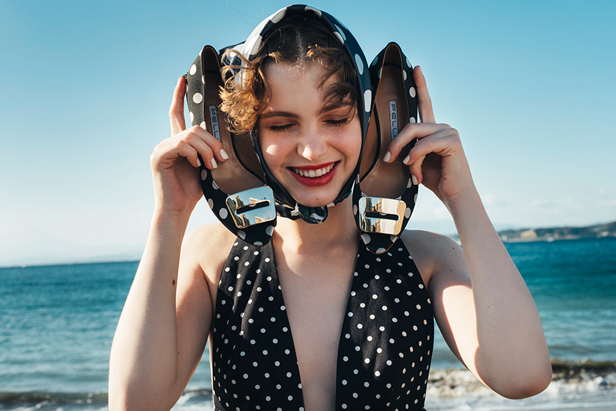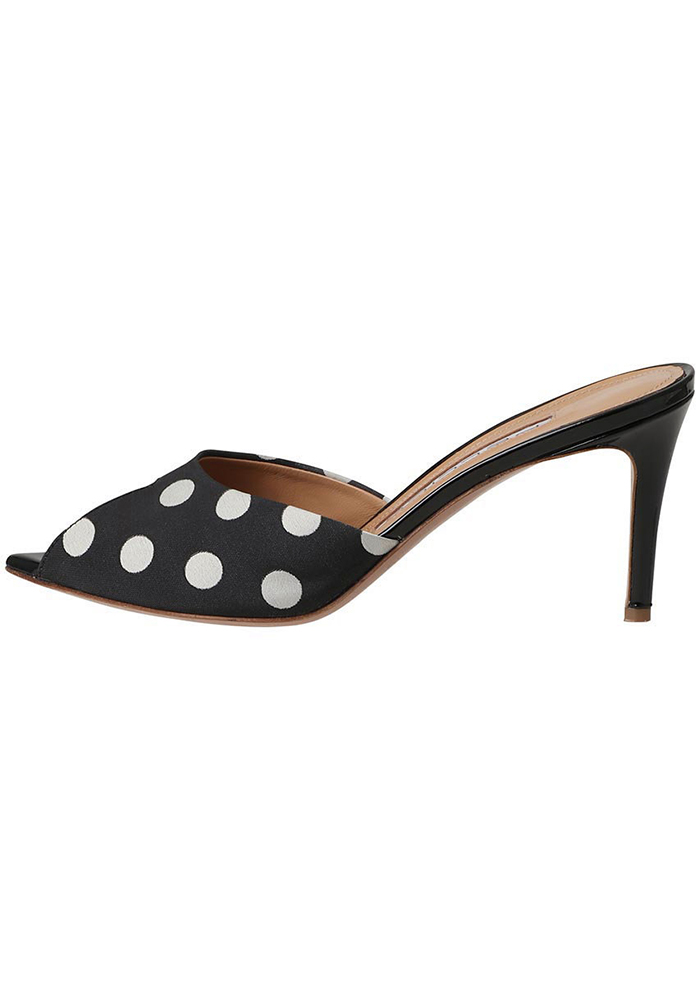 「同じドット柄のミュールサンダルも展開。抜け感のあるオープントゥ仕様が、軽やかな印象です。甲を包み込むアッパーと安定感のあるセットバックヒールにより、女性らしい美シルエットと快適な履き心地を両立。スリッパ感覚でさっと履けるため、デイリーからお出かけ、リゾートシーンまで使えます。シンプルなコーディネートに合わせるだけで、上級スタイルに」。