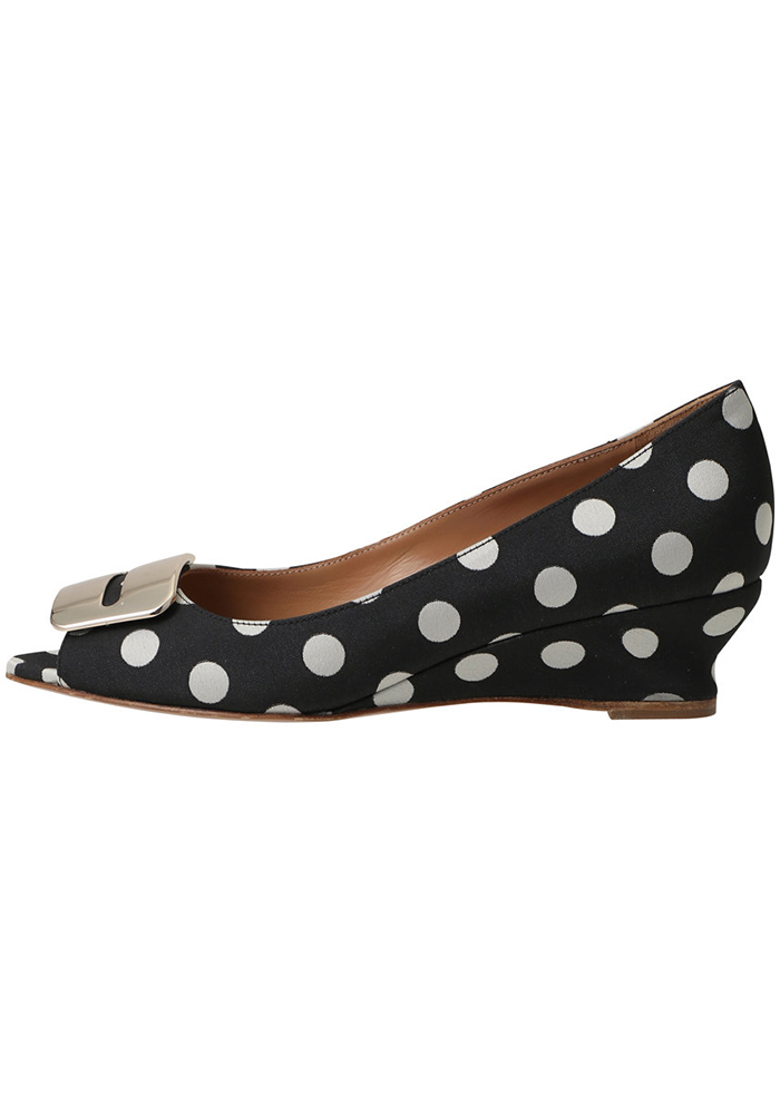 「まずは、クラシカルなドット柄が目を引く、上品さと遊び心を兼ね備えたウェッジパンプス。落ち着いたブラックベースにホワイトドットを配し、足元にほどよい華やかさをプラスします。つま先はオープントゥ仕様で、軽やかさと女性らしさを演出。フロントにあしらったミニマルなスクエアモチーフが、全体を引き締めるアクセントに。安定感のある低めのウェッジソールは、長時間の着用でも疲れにくく、デイリーからお出かけまで幅広く活躍します。パンツにもスカートにも好相性」。