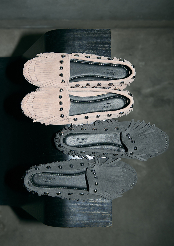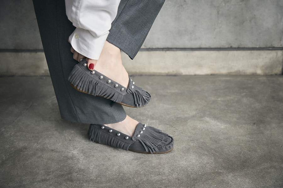 「モカシン用の木型“サコ”が生み出す、思わず毎日手に取りたくなる快適なフィッティング。2025年秋冬にデビューして以来、その履き心地とモードな佇まいが好評を博しています。今季、やわらかなピンクとグレーが新色として仲間入り。ほんのりとニュアンスを含んだペールトーンの2色は、“サコ”のシャープなシルエットに軽やかな表情を添え、ロングフリンジの動きをよりいっそう引き立てます」。