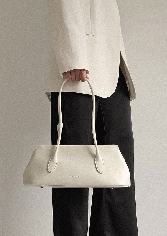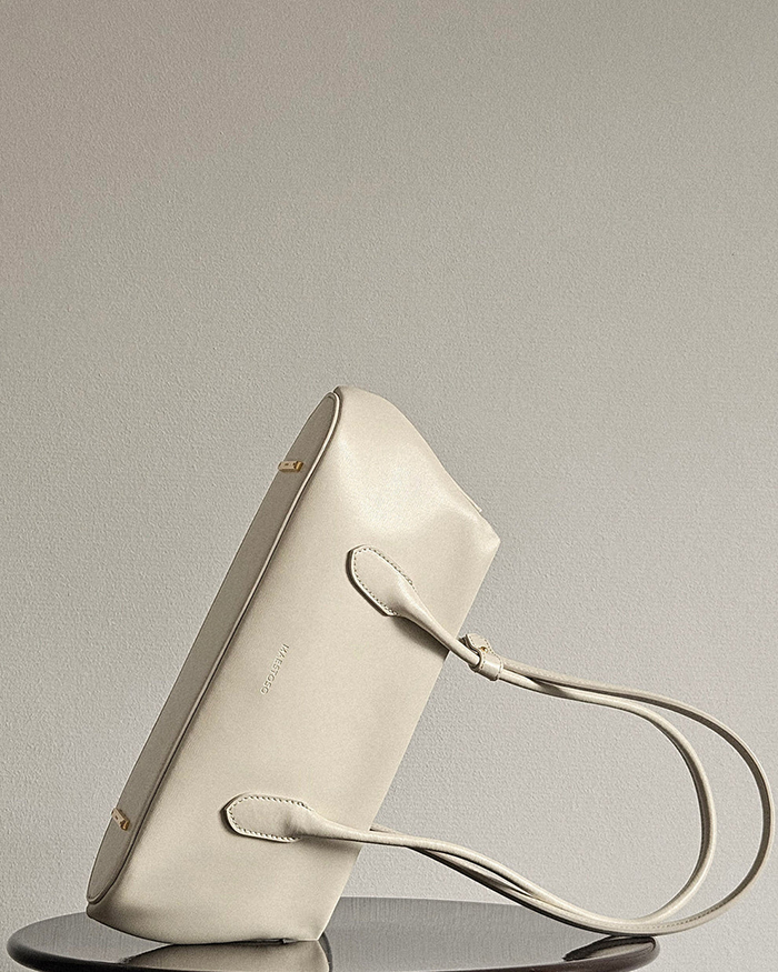 「新作の“リネア”は、“オーロラ”シリーズをミニマルに再解釈したデザイン。細長いシルエットとやわらかく丸みのあるフォルムが、さりげなく洗練された印象を与えます。本体から自然につながるトップハンドルは、見た目の美しさだけではなく持ちやすさも◎。動きに合わせてなめらかになじみ、日常使いしやすいバランスに仕上がっています。シンプルながら存在感があり、カジュアルからきれい目まで幅広く対応。流行に左右されず、長く使えるバッグです」。