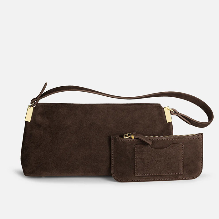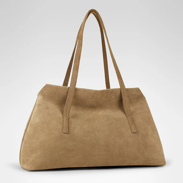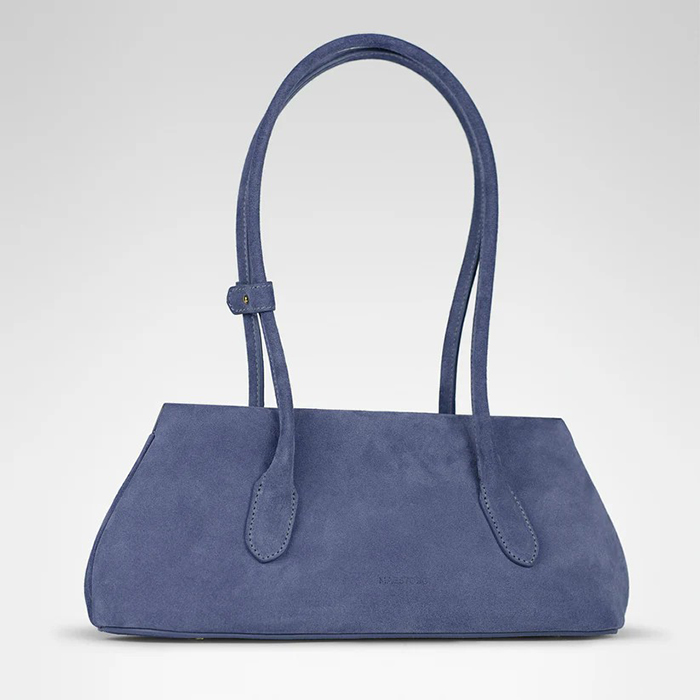 「すっきりとした横長シルエットが印象的な“オーロラ バゲット”。モダンななかに、長く受け継がれてきたものづくりの背景を感じさせる、シンプルで洗練されたバッグです。無駄を省いたデザインと美しいフォルムは、どんなスタイリングにも自然になじみ、持つだけで大人な印象に。さりげないステッチやなめらかな仕上がりから、職人のていねいな手仕事が感じられます。素材には、イタリアの老舗タンナーによる上質なスエードレザーを使用。しっとりとした手触りと上品な表情は、長く愛用するほどに味わいが増していきます」。