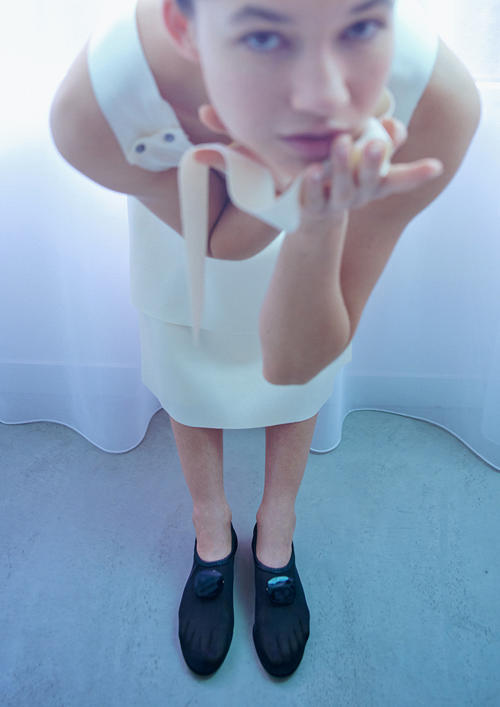 「2025年秋冬に誕生した“ストーン”シリーズ。硬質な素材に柔らかさを残す繊細なカットのストーンが、足元に優しい陰影を生み出します。メッシュを使用したスリッポンタイプのこちらは、伸縮性のある素材が足をやさしく包み込み、ストレスフリーな履き心地を実現。ゴム仕様の履き口によって着脱もスムーズです。上品な透け感も軽やかな印象」。