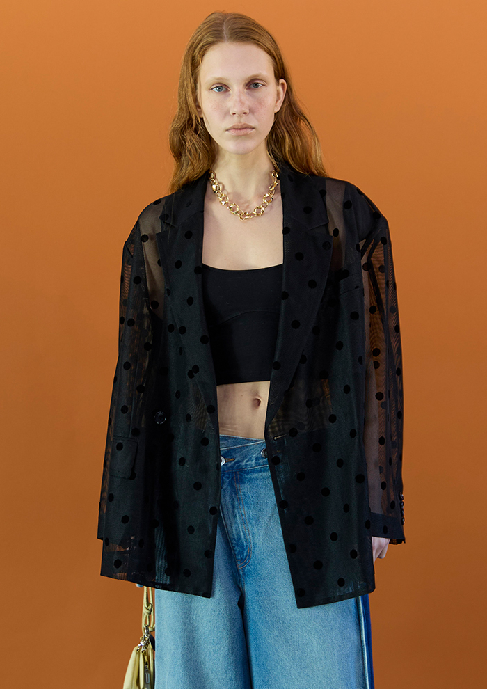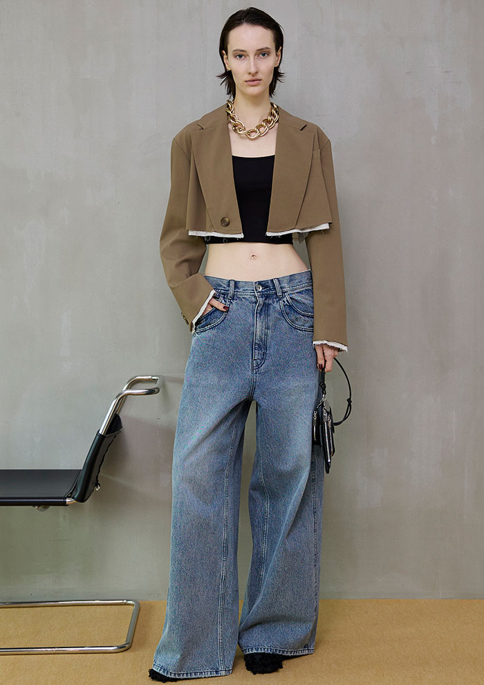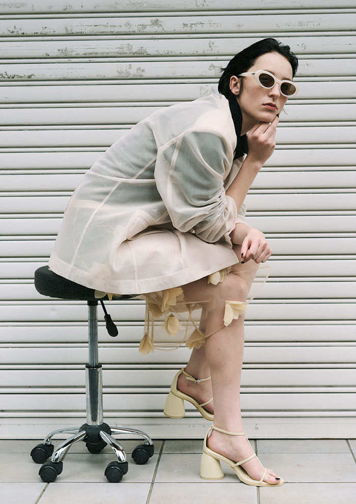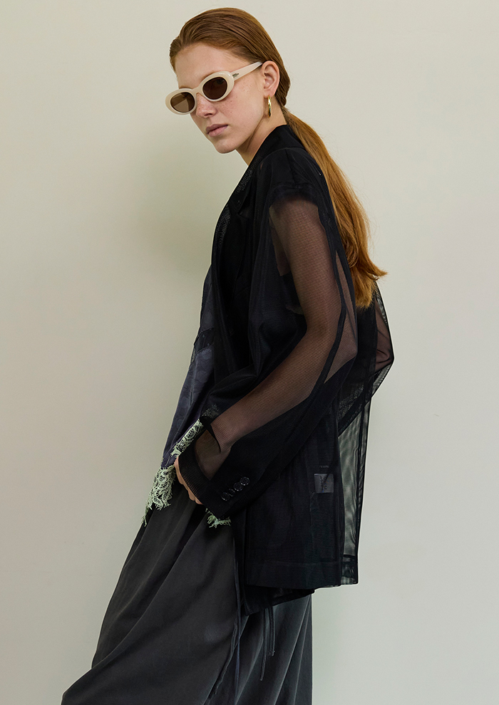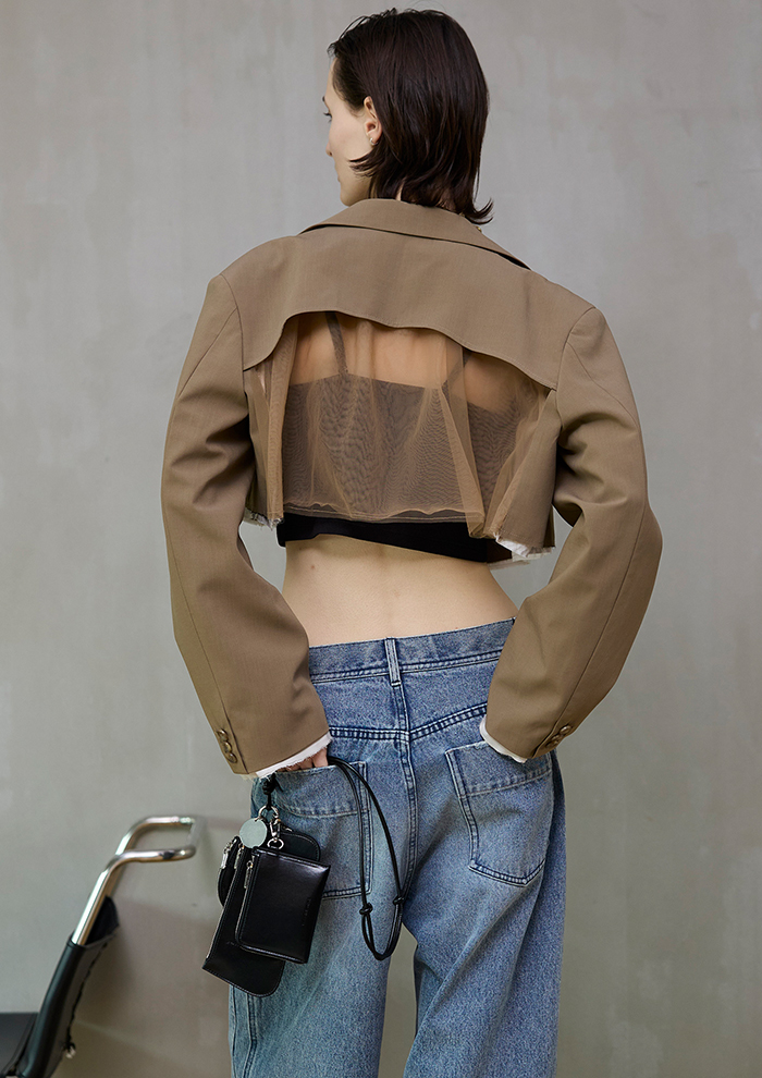 「前面はシャープで無機質な印象のショートジャケットに、バックスタイルには繊細なチュールを組み合わせ、軽やかな動きをプラス。ウエスト位置を高く見せるショート丈は、ボリュームのあるパンツとも好相性です。異素材のコントラストが装いに奥行きを生む、計算されたスタイリング」。