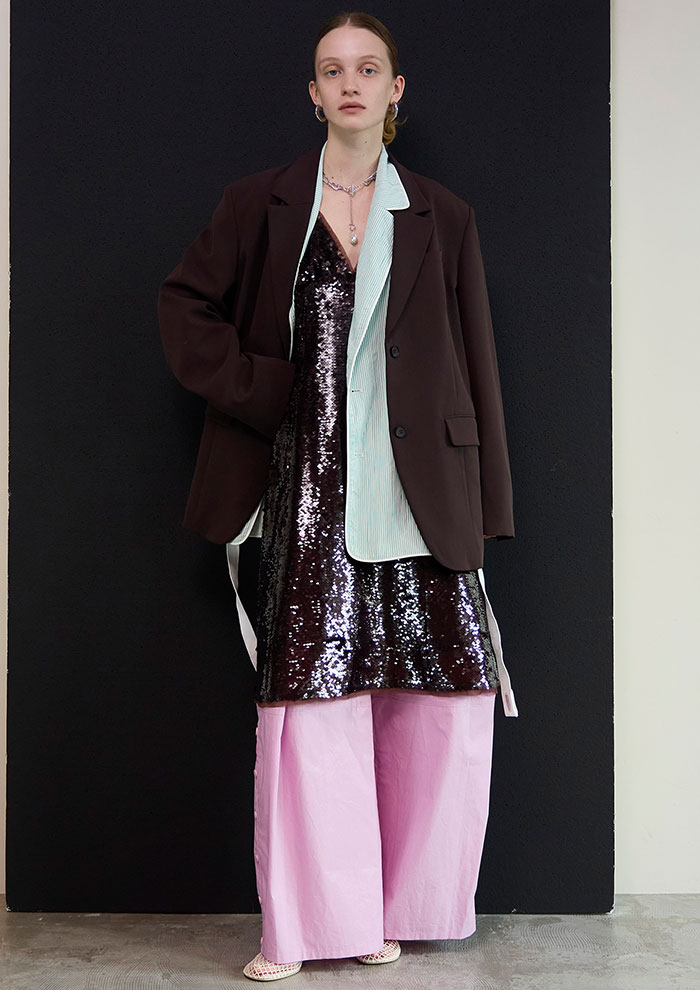 「ピンクのジャケットにショートパンツを合わせたら、ブラウンシャツで大人の引き締めを。一方、 端正なジャケットにはスパンコールのきらめきを添え、コントラストによってワンランク上のスタイリングに」。