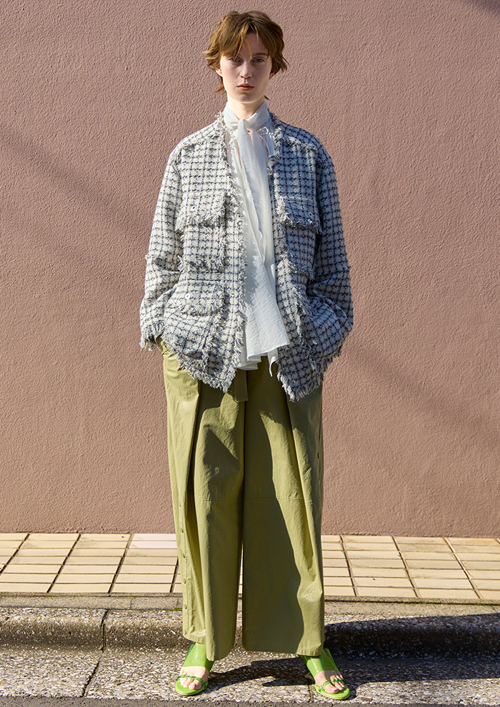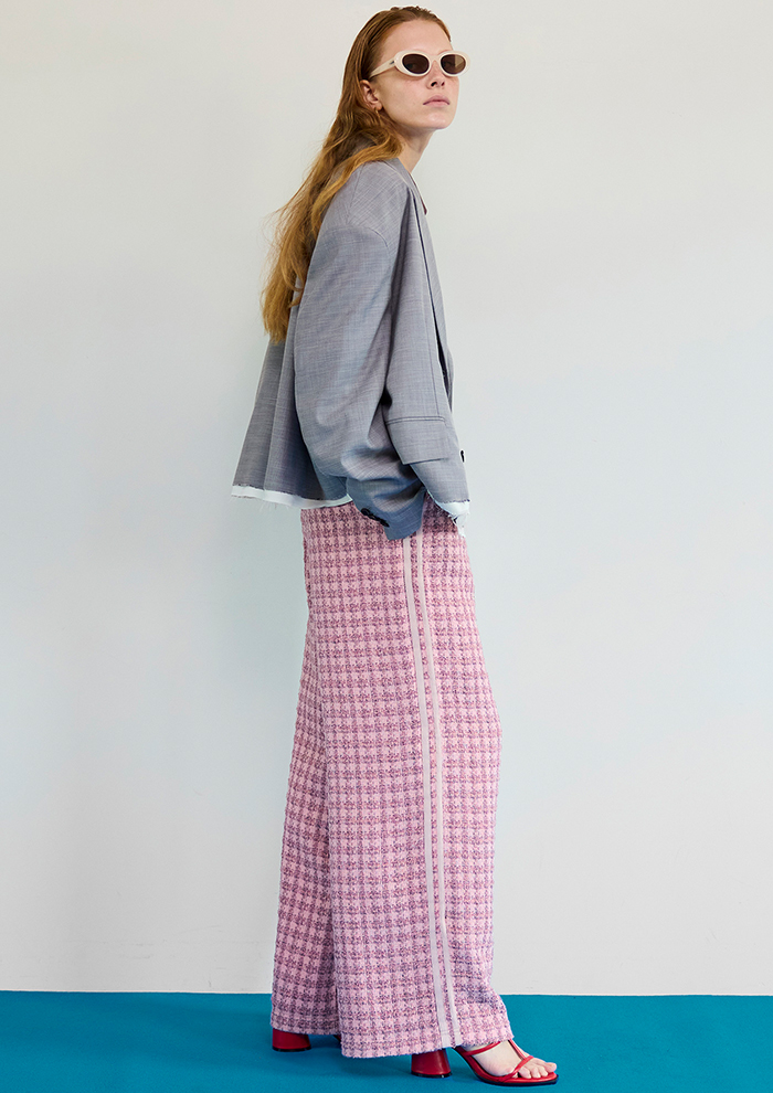「主役級の存在感を放つツイード素材のロングパンツに、ショート丈ジャケットを合わせて今季らしいプロポーションに。素材の表情を引き立てながら、端正さとモード感を両立。単品でも活躍するからこそ、スタイリング次第でオン・オフを軽やかに行き来して」。