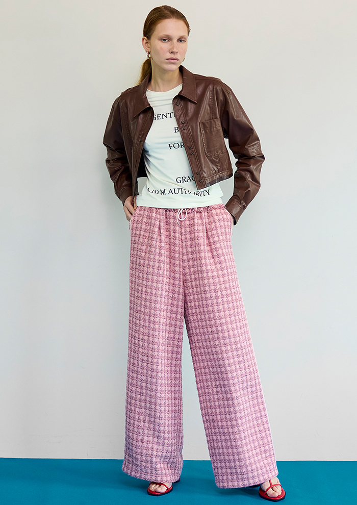「ピンクツイードにグレーのカットオフジャケットを合わせると、軽やかにモードアップ。ブラウンレザーのショートシャツなら、温かみのあるコントラストを演出できます」。