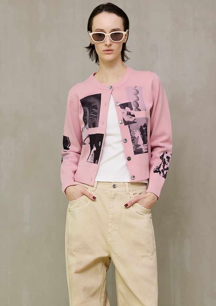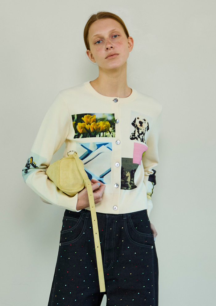 「カラーにより表情を変えるキャッチーなフォトプリントニットカーディガン。コラージュしたフォトプリントが他にはないインパクトがあり、ミラノリブで編み立てたことで、もっちりとした肌心地を実現。存在感がありながらも見た目も素材も柔らかく、ロングシーズン着用できます」。
