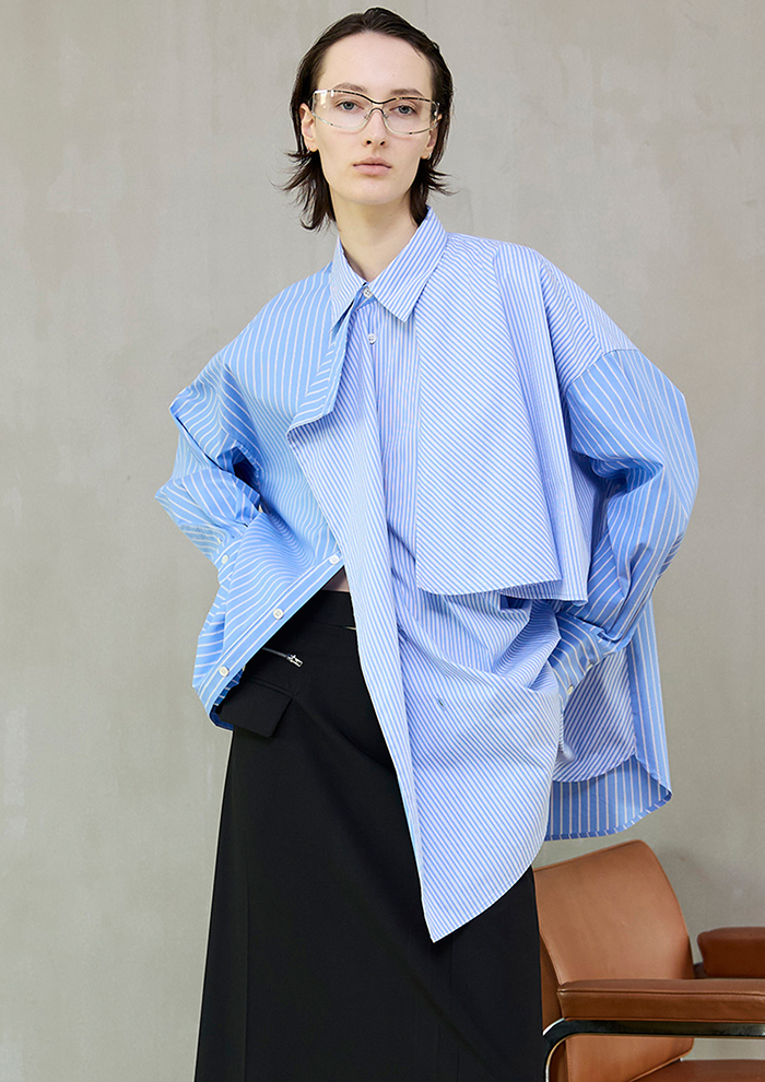 「たっぷりと分量をとったケープデザインをアシンメトリーに配し、構築的でありながら軽やかな表情に仕上げたシャツ。ハリ感のあるシャツ素材で仕立てることで、動きに合わせて美しいフォルムを描き、スタイリングに洗練されたニュアンスを添えます」。