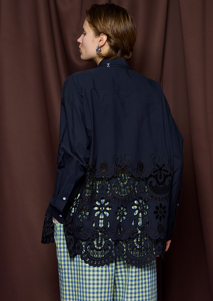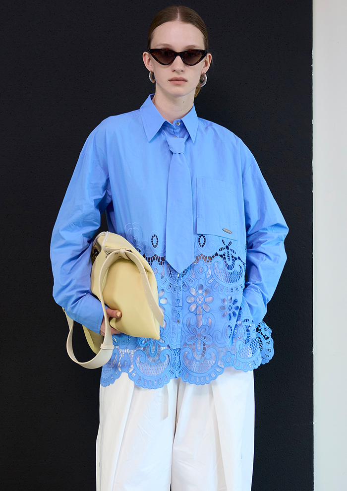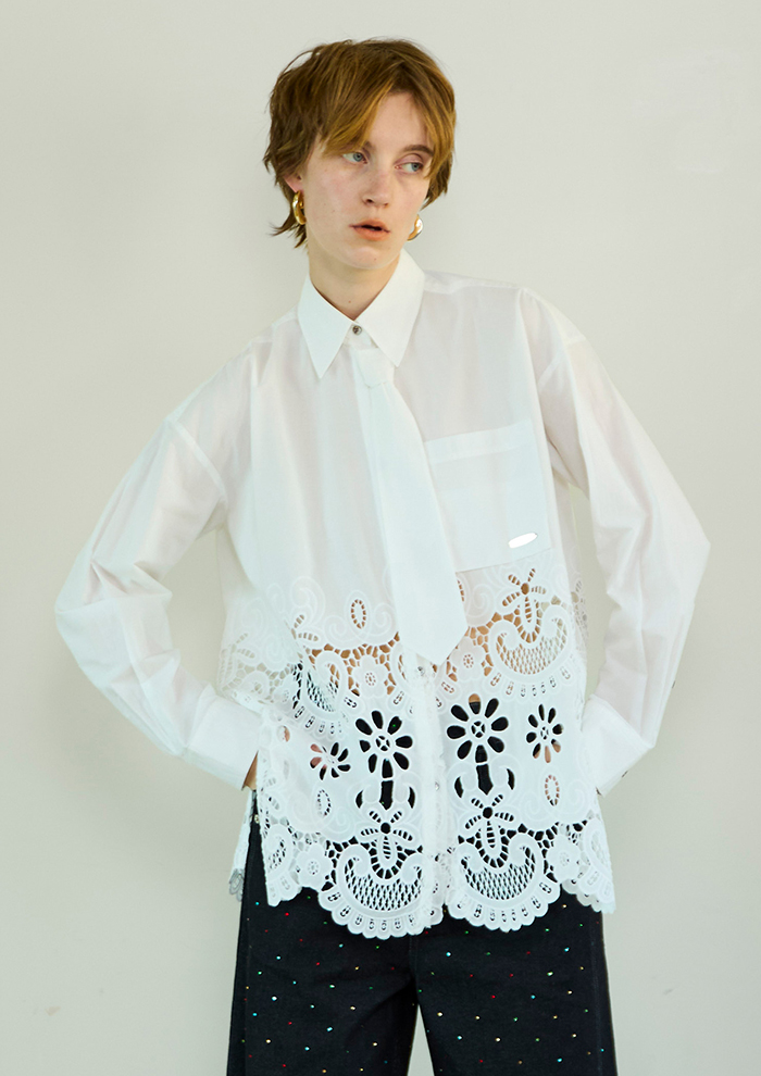 「上質なコットン素材で仕立てたシャツは、ヘムラインに施した大胆な刺しゅうが華やかなアクセント。付属のネクタイをプラスすればクラシックなムードに、外しても楽しめる2WAY仕様です。デニムでカジュアルに、スラックスでドレッシーにと、幅広く活躍。ショート丈ジャケットを重ね、裾から刺しゅうを覗かせたスタイリングもおすすめ!」