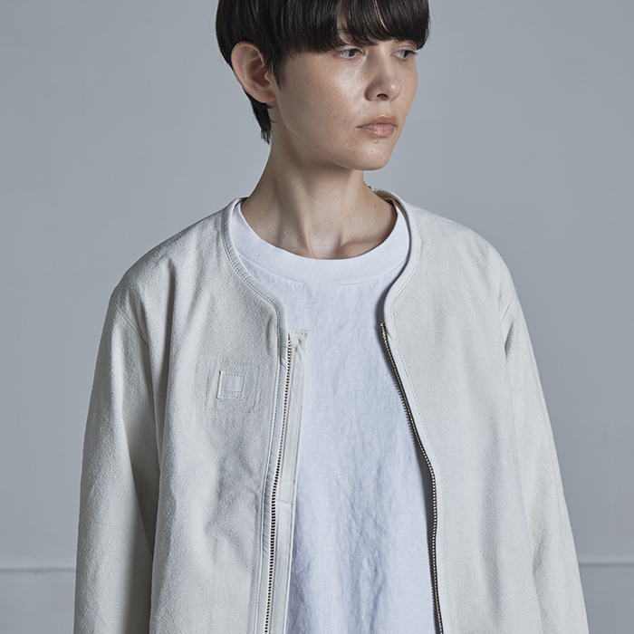 「「シシ」のノーカラースエードジップアップジャケットは、カーディガンのように、シャツのように気負わず羽織れる一着です。ショート丈のバランスがほどよい抜け感を生み、ワイドパンツからスカート、ワンピースまで幅広く好相性。ノーカラーデザインにすることで、首元はすっきりと、インナーを選ばず季節の変わり目にも活躍します。上質なスエードならではの柔らかな風合いと、体に自然になじむ着心地。軽やかでありながら、羽織るだけで装いを格上げしてくれる、大人のためのレザージャケットです」。