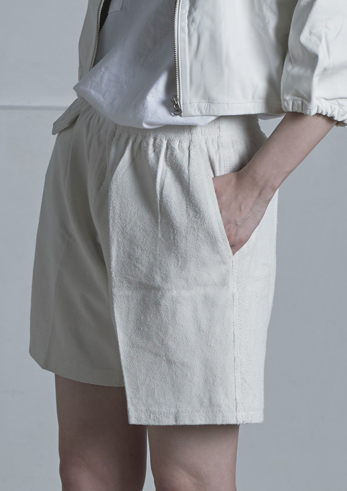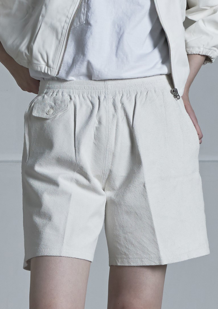 「クラシックなミリタリーデザインをベースに、女性らしく、そしてモードに昇華したスエードのアーミーショーツ。しなやかで上品な素材感が、ミリタリー特有の無骨さを適度に中和し、はくだけで洗練をもたらします。腰まわりはすっきりと、シルエットはリラックス感を残しながら、女性の体を美しく見せるバランスに」。