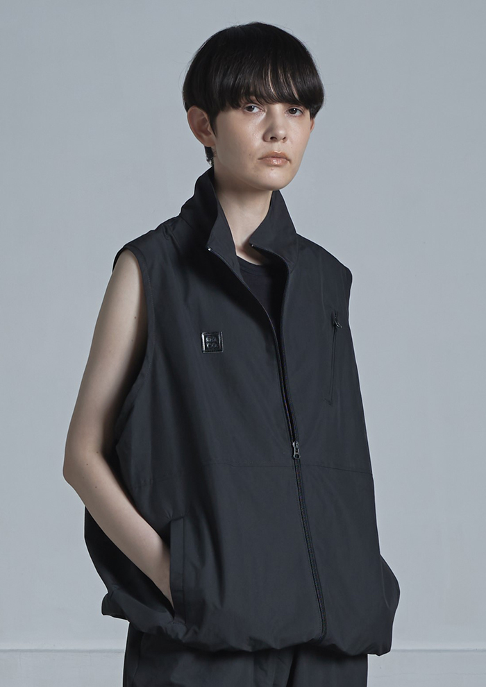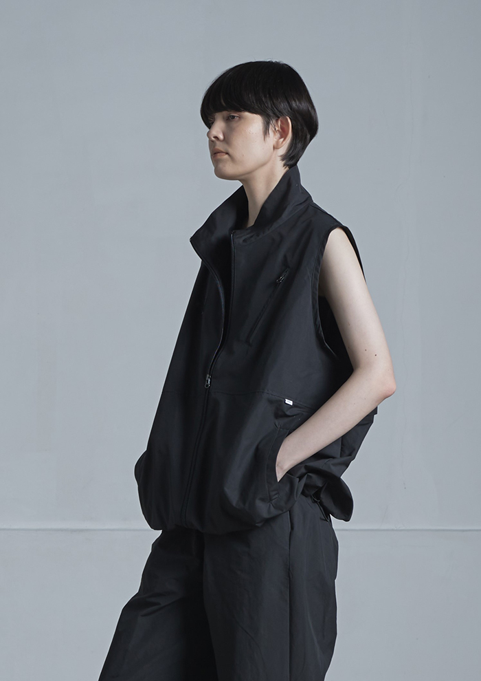 「機能性素材に撥水加工を施した、日常からアクティブシーンまで対応するハイネックベスト。ゆったりとしたシルエットが体のラインを拾わず、重ね着しやすい設計です。ハイネックデザインが首元をやさしく包み込み、シンプルなスタイリングに存在感を添えて」。