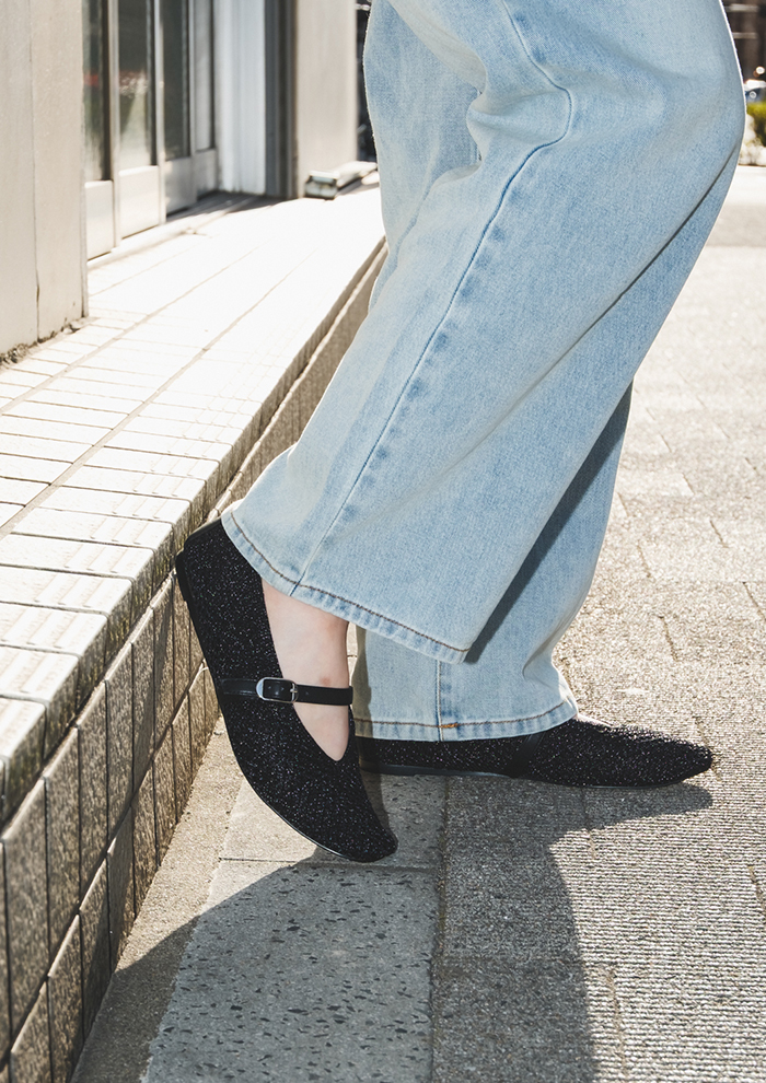 「編み込みメッシュの表情が、さりげないニュアンスを添える「GAYLA」は、デニムやスラックスのハンサムスタイルはもちろん、ワンピースやスカートのフェミニンな装いにも好相性。オン・オフ問わず活躍する、大人のワードローブに寄り添う万能パンプスです。ブラックカラーと編み込みの抜け感が、重く見えない洗練された足元を実現。歩きやすいフラット設計で、デイリーから通勤、お出かけまで幅広く活躍します」。