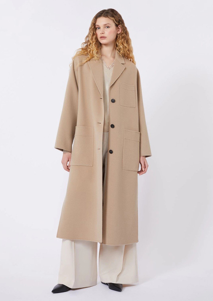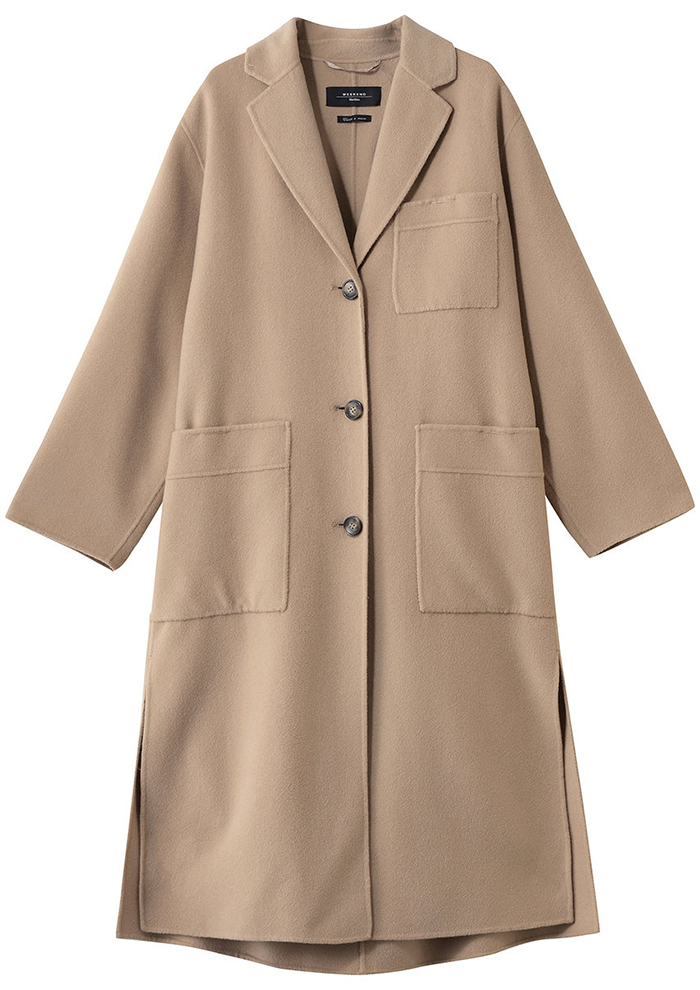 「まずは、フロントの大きなパッチポケットが目を引くダブルフェイス仕立てのロングコートから。上質なウール生地を、熟練した職人の手仕事でていねいに一重に仕立てており、柔らかくて軽い、コンフォートな着心地です。シルエットはラペルカラーのシングルブレスト。ゆったりとしたドロップショルダーと、深いサイドスリットがアクセントです。スカートにもパンツにも合わせやすいレングスで、幅広いコーディネートに活躍」。