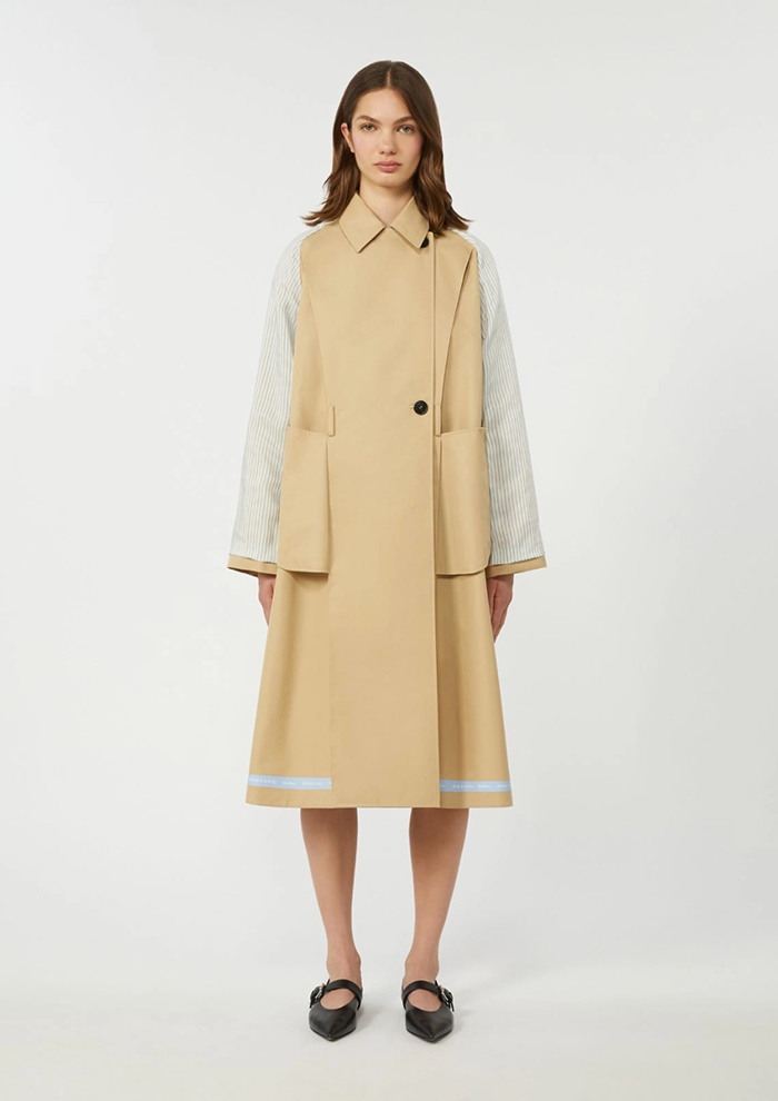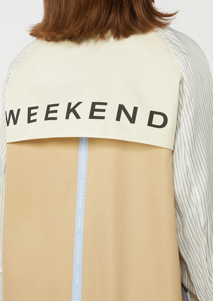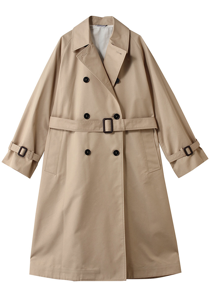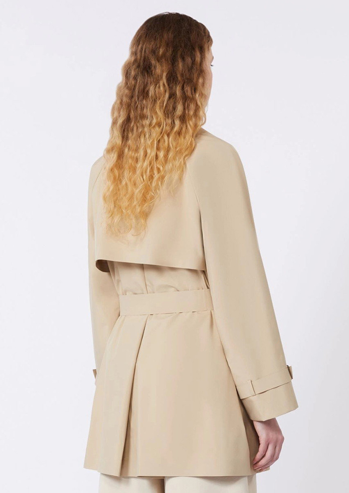 「ベーシックカラーで幅広いスタイリングに合わせられる、WEEKEND MAX MARAの定番トレンチコート。はっ水加工のテクニカルキャンバスを使用し、ほどよい光沢とハリのある素材感ながらもコンフォートな着用感が魅力です。シャツカラーでも楽しめるワイドラペルカラーにダブルブレストのミディレングス。レインケープをあしらったバックスタイルがクラシックな雰囲気です。ブランドロゴ入りのハーフライニングと、アクセントカラーのテクニカルテーピングをあしらった内側とのリバーシブル仕様」。