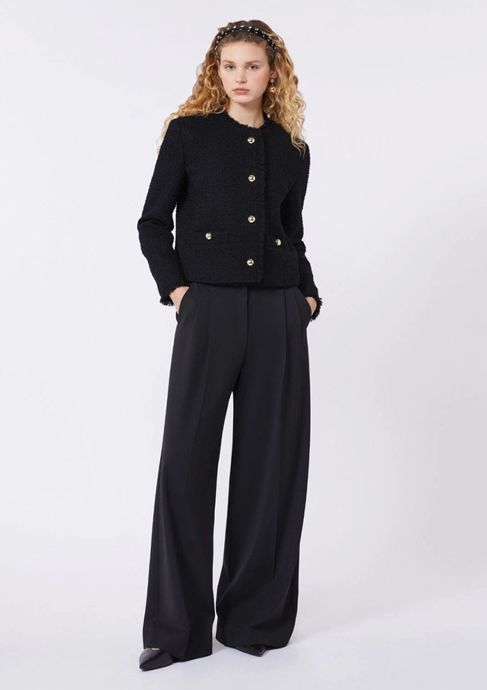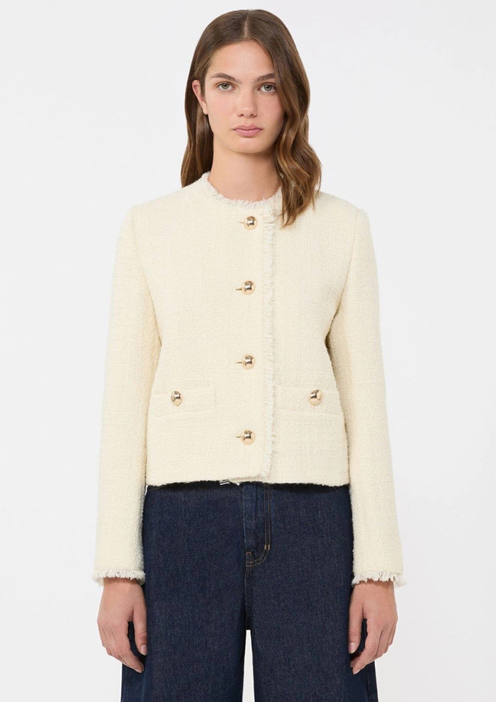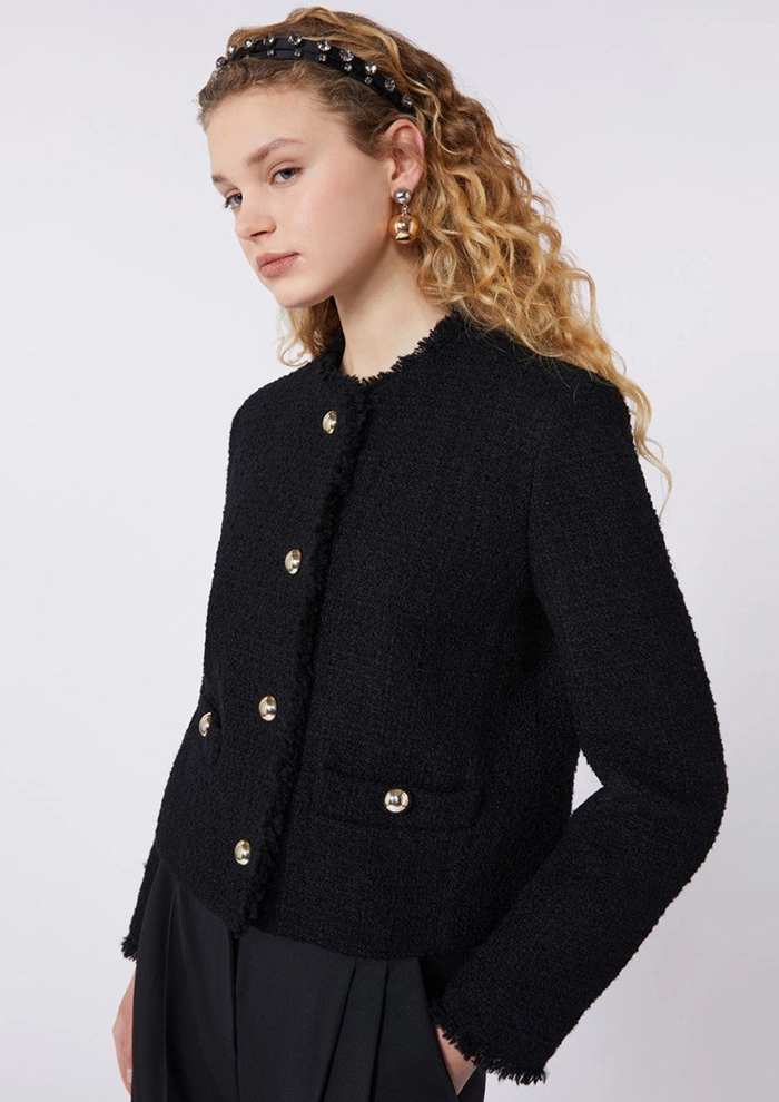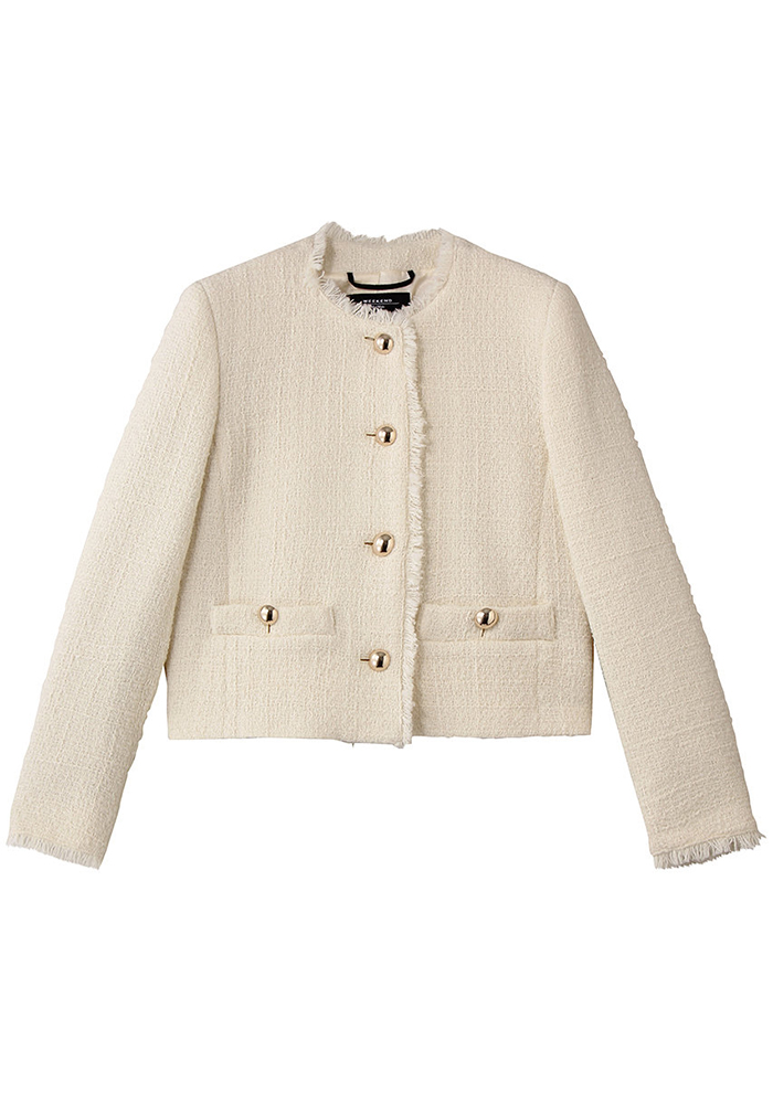 「フリンジ仕上げの縁取りが印象的な、ツイード素材のクロップド丈シングルブレストジャケット。ほどよい凹凸感のあるウール混ツイードが、上品さのなかに表情を与えます。コンパクトなストレートシルエットとラウンドネックが、すっきりとしたバランスを演出。フロントやポケットにあしらったメタルボタンも、クラシックなムードにさりげないアクセントを添えます。裏地付きで着心地がよく、さまざまなスタイリングに対応。カラーは、柔らかく華やかな印象のホワイトと、洗練されたシックなブラックの2色展開」。
