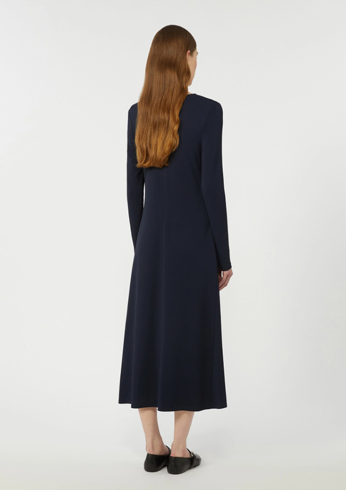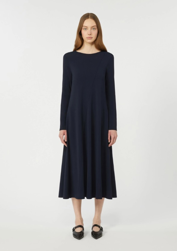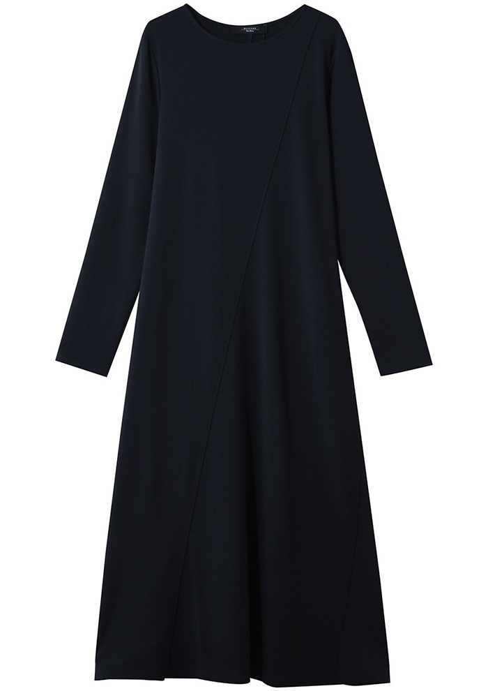 「ウエストラインを美しく引き立て、裾に向かって優雅に広がるロングドレス。素材には、しなやかで落ち感のあるビスコースのジャージークレープを使用しています。首元はすっきりとしたクルーネック、袖は腕に自然に沿う長袖デザイン。フロントには斜めに切り替えたインターシャ風ディテールを施し、さりげない個性と立体感をプラスしました。裏地のない軽やかな仕立ても、ストレスフリーな着心地」。