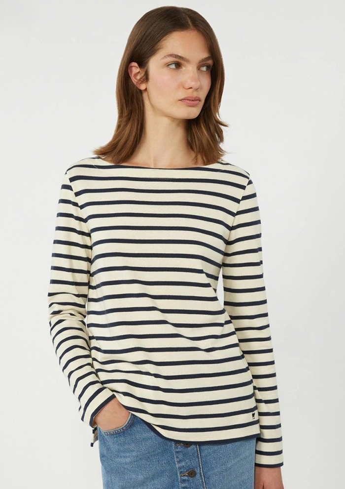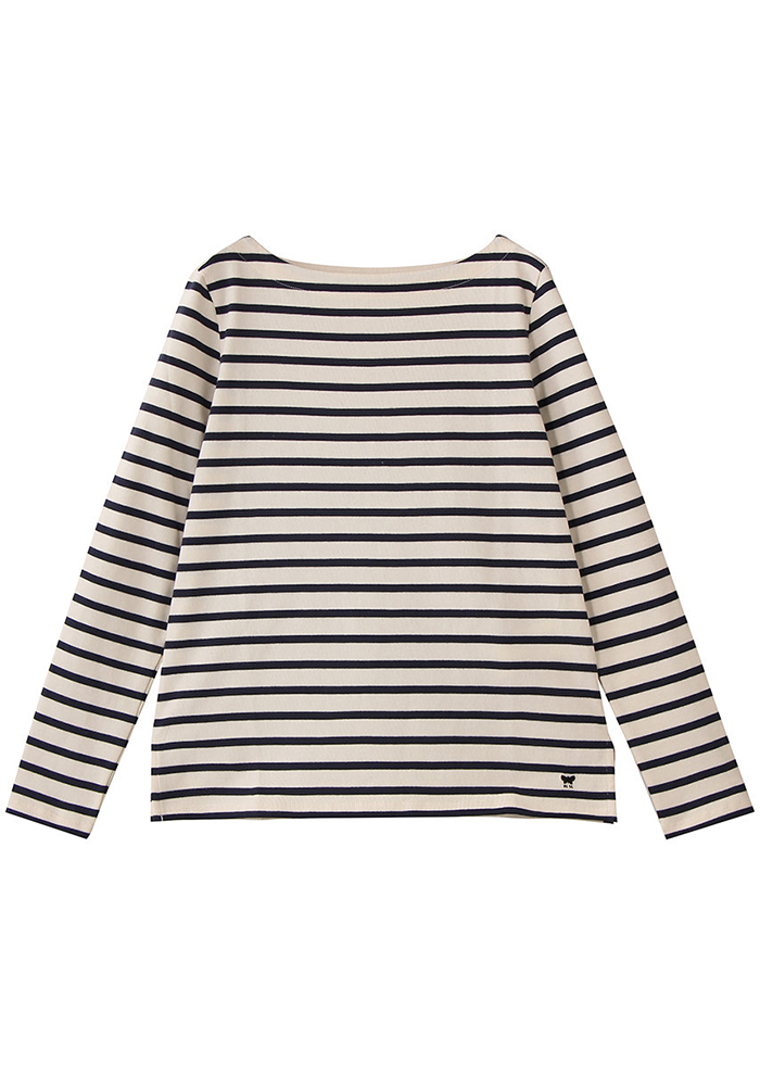 「ベーシックなデザインが光るボーダー柄Tシャツ。オーガニック農法に従って栽培・加工されたコットン繊維によるジャージー生地は、しっかりとした質感ながらもソフトな肌触りが快適です。シルエットは、ボートネックにドロップショルダーのボックスフィット。サイドのバタフライモチーフがさりげないアクセントです。ボーダーTシャツは、カーディガンやジャケットのインナーとしても使いやすく、幅広いコーディネートに◎」。
