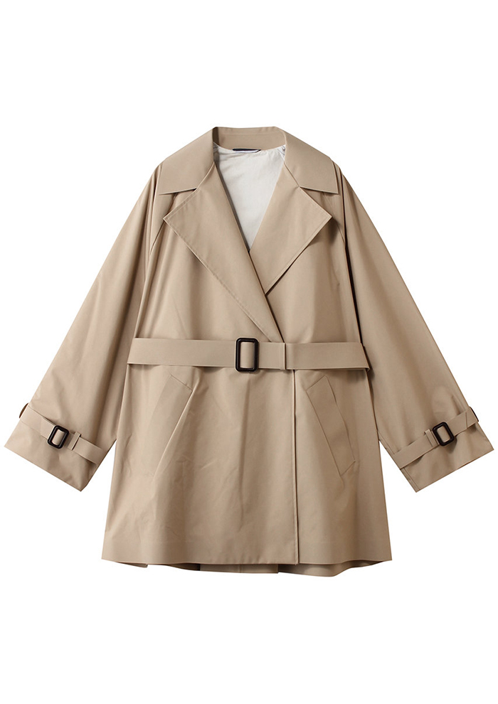 「やわらかなシルエットが女性らしさを引き立てる、ショート丈のトレンチコート。マントのようなケープディテールとウエストマークできる共布ベルトが、洗練された印象を演出します。撥水性のあるテクニカルキャンバス素材を使用し、軽やかな着心地と機能性を両立。大きめのテーラードカラーやダブルブレストのデザインが、クラシックでありながら現代的な雰囲気を添えます。内側にはロゴプリントをあしらい、さりげないポイントに。日常からきれい目スタイルまで、幅広く活躍します」。