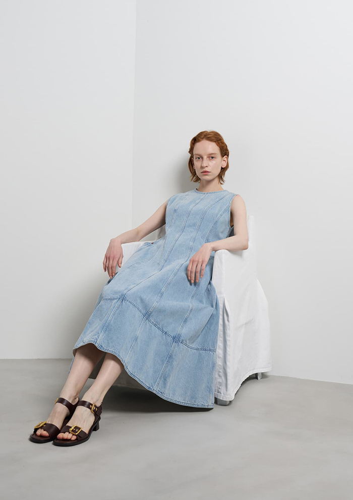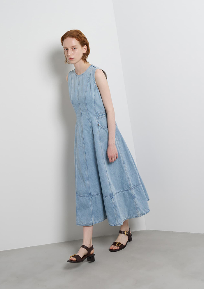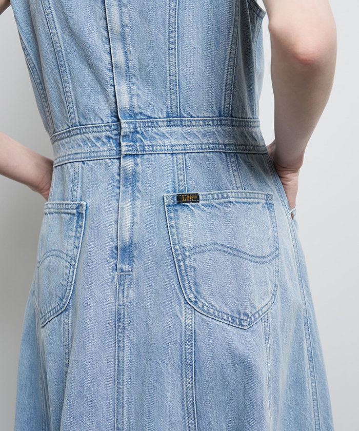 「「ランバン オン ブルー」オリジナルのワンピースを、「リー」のデニムと融合させ完成した特別なコラボレーションアイテム。たっぷりとフレアを効かせたレディライクなシルエットに、「リー」の王道シリーズ“RIDERS”で使われるリベットやピスラベル、刻印入りファスナーを取り入れています」。