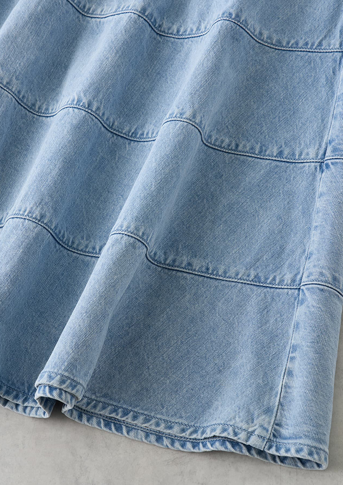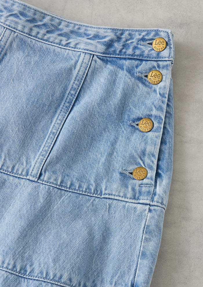 「「ランバン オン ブルー」オリジナルのスカートを、「リー」のデニムと融合させ完成した特別なコラボレーションアイテム。たっぷりと広がるフレアシルエットに、あえて「リー」の王道シリーズ“RIDERS”で使用される刻印入りタックボタンを採用しています」。