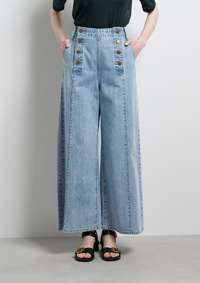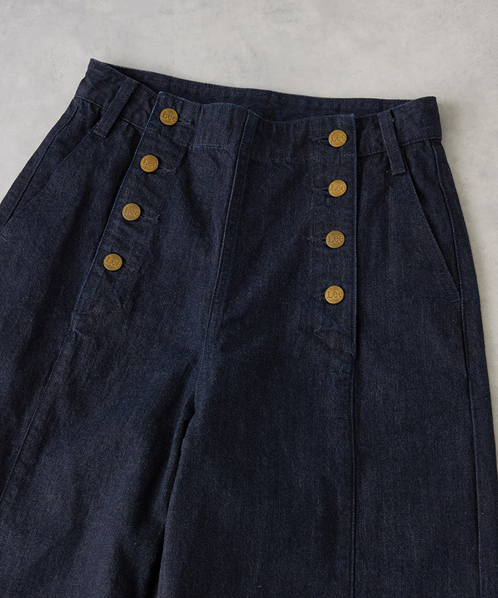 「「ランバン オン ブルー」オリジナルのマリンパンツを、「リー」のデニムと融合させ完成した特別なコラボレーションアイテム。すっきりとしたベルトレスウエストからまっすぐに落ちる、ほどよいボリュームのワイドシルエットが魅力です」。