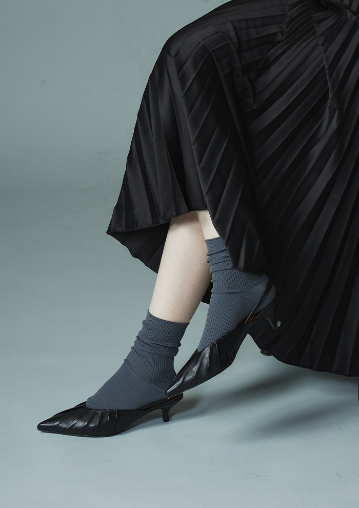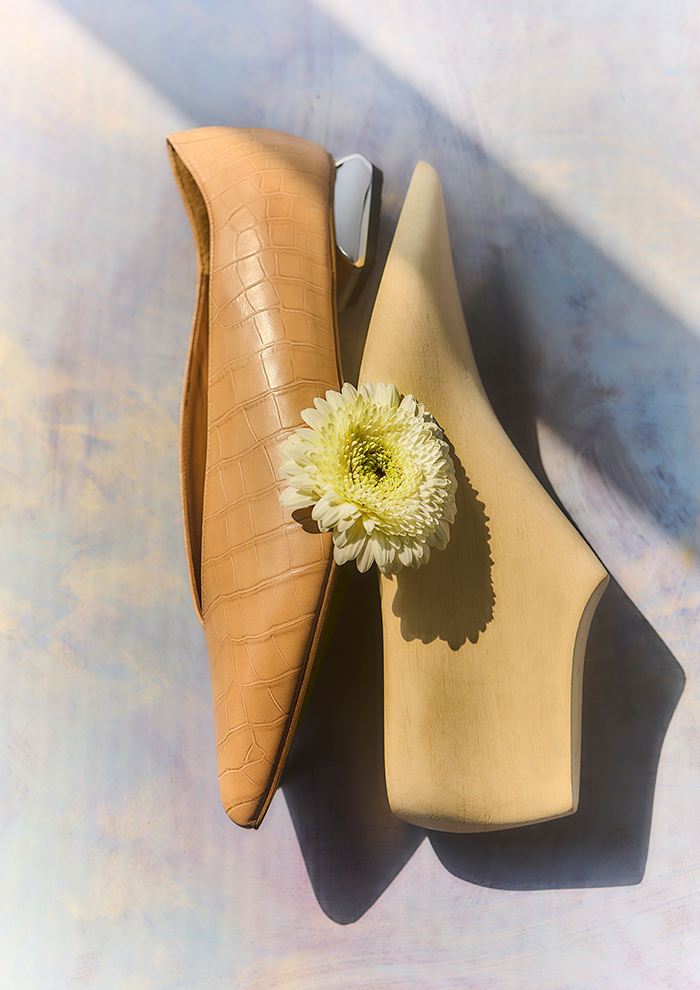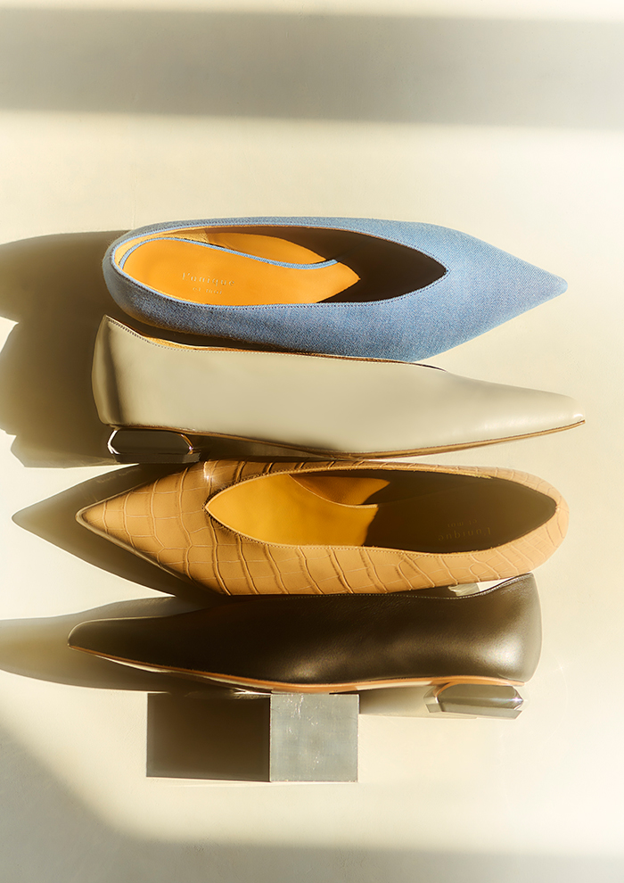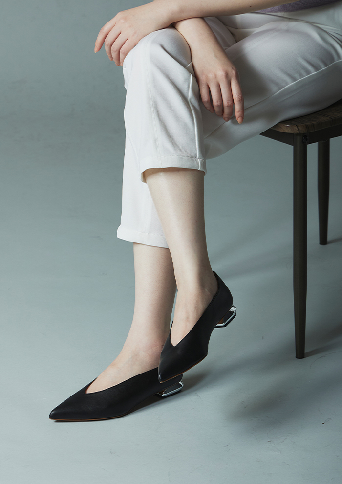 「まずは、深いVカットが足の甲を美しく見せる、上品さとエッジさのあるパンプス“Vague”。ブラックとベージュクロコの型押しに、シルバーメッキ加工のヒールが全体を引き締めるアクセント。岡山の倉敷デニムとリトアニア産リネンの表地を使用したモデルは、軽やかなスタックヒールで春らしく、軽やかな印象です。トップラインを湾曲させたデザインが足もとに都会的な雰囲気をプラス。たくさん歩いても疲れにくいローヒールで、仕事からオケージョン、カジュアルシーンまで活躍します」。