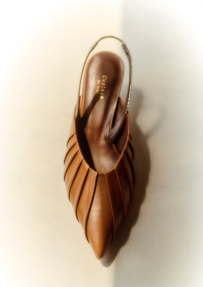 「こちらは、フロントにタックデザインを施したバックストラップのパンプス“Fleur”。なめらかな羊革を使用しており、モードさがありながらもソフトな印象で気軽に履いていただけます。ブラウンは配色になったバックストラップがポイント。アンクレットと合わせてもすてきです。ソックスやタイツにもマッチするデザインなので、カジュアルの外しにも、エレガントスタイルにも対応。春〜秋までの長い時期、足元のコーディネートを楽しんでいただけます。安定感のある4.5cmヒールは、スタイルアップを叶えつつ快適な履き心地を実現」。