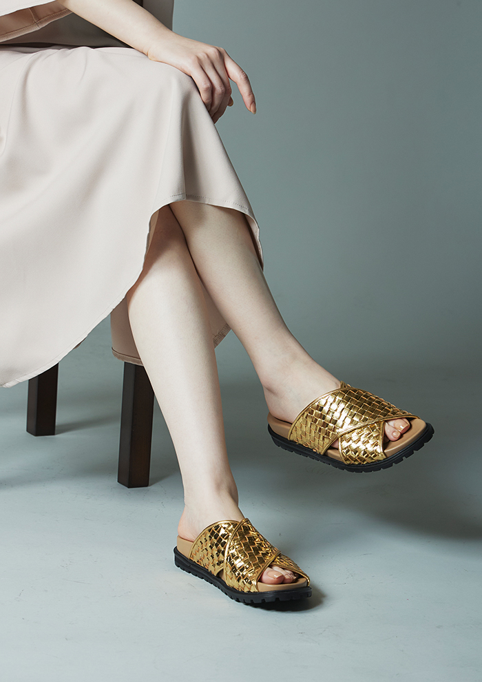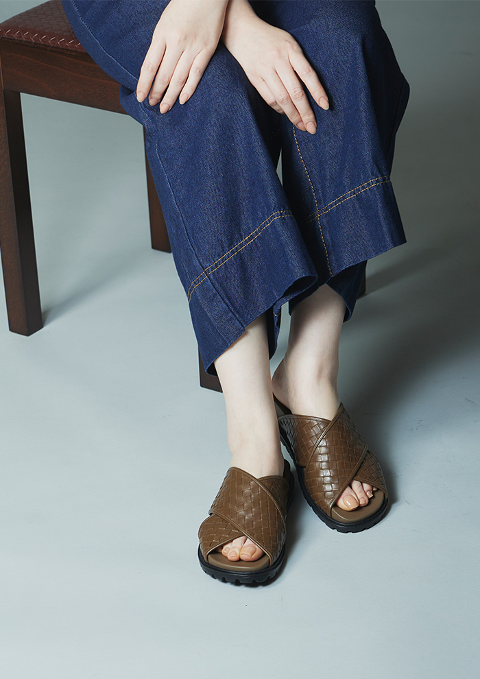 「クロスストラップをレザーの編み込みでラグジュアリーに表現したエル・ショップ限定サンダル“Sophie”。カーキはオリジナルで染めたカラーでシックな印象。ゴールドは華やかな足元を演出します。2cmのタンクソールはスタイルアップ効果があり、足元にボリュームを足したいときに頼れる存在」。