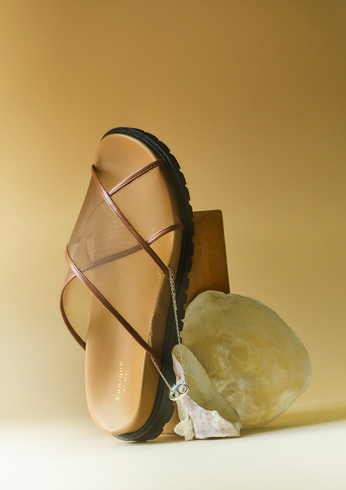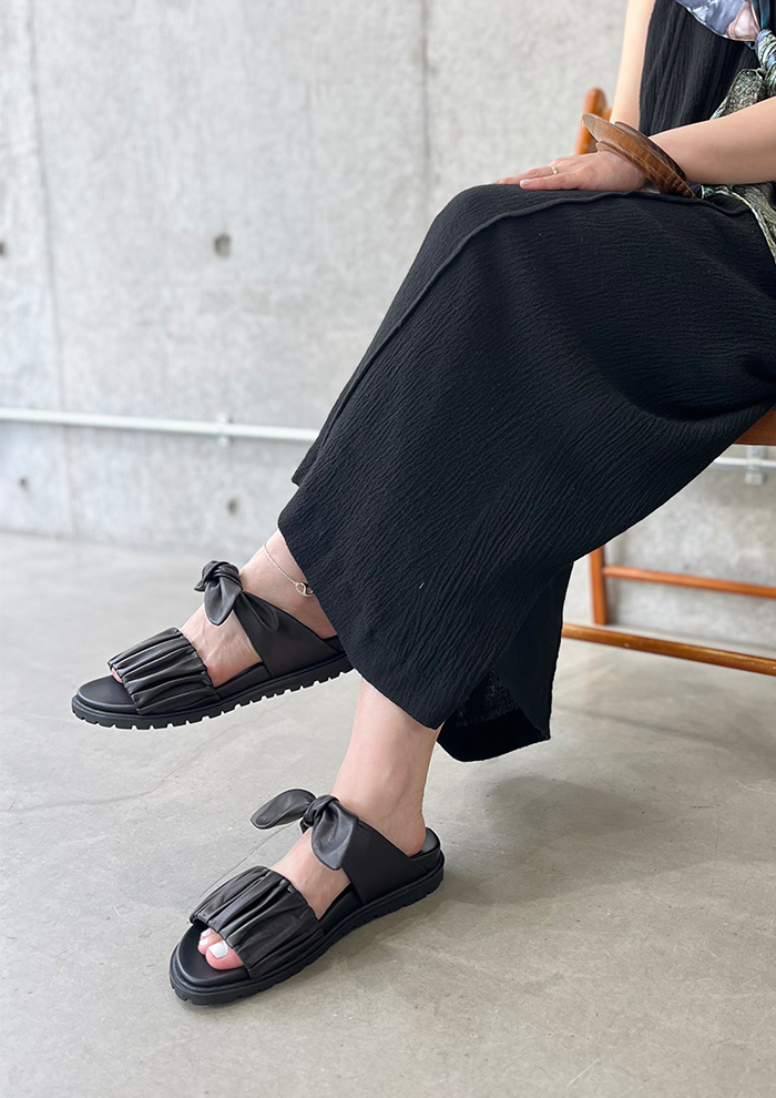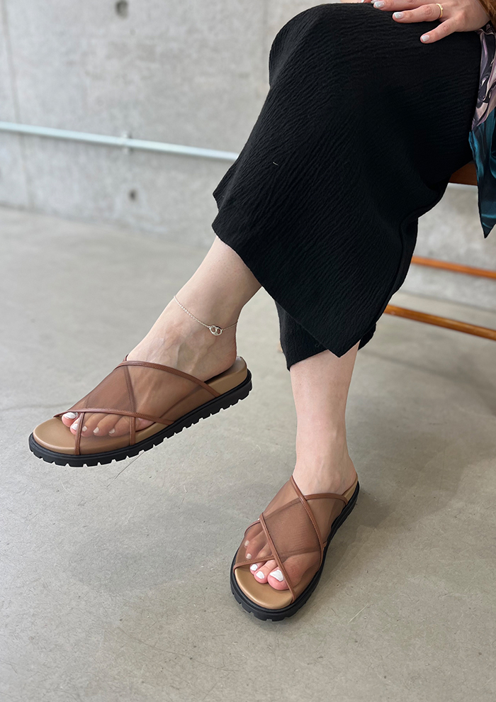 「涼しげなチュール素材にレザーのパイピングを施したクロスストラップサンダル“Clair”。足元にフェミニンな抜け感とトレンド感をプラスし、モードからカジュアル、ビンテージまで幅広いスタイルに合わせやすいです。こちらもタンクソールなので、気軽に履きやすく春夏スタイルに最適」。
