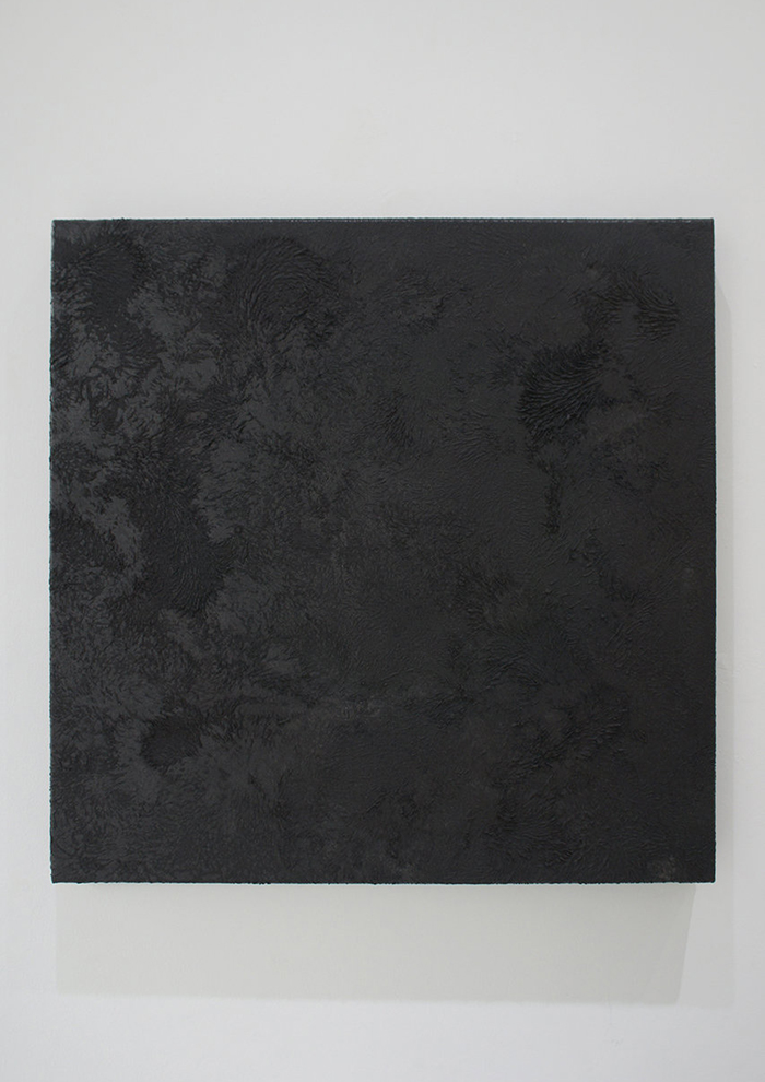 キャンバスに塗料と鉄粉を混ぜたものを塗り、裏から磁石を動かすことで、身体的にドローイングをしていく。一度きれいに描かれた磁力線も次の線が重なると崩れてしまうので、それを修正するためにまた次の線を描く。「塗料が半硬化するまでの間、僕はずっと磁石を動かし続けていて、キャンバス上で取り交わされたその僕と素材のコミュニケーションの結果を作品としています(相澤さん)」
