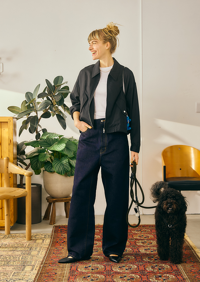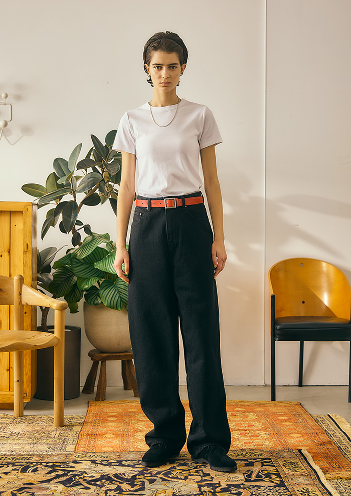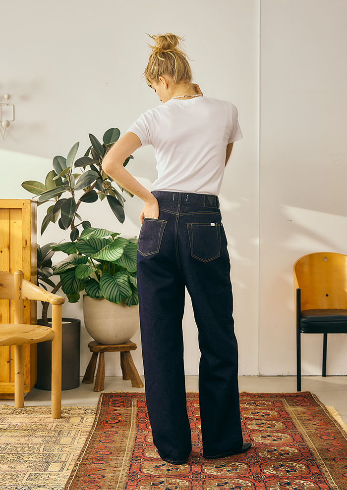 「春夏コレクションのテーマにもなっている“BUDDY ジーンズ”は、リラックスしたシルエットなのにスタイルが良く見えるジーンズをつくりたいという染谷の思いから誕生しました。腰高に見えるハイウエストで、腰ばきしたかのような雰囲気を表現したく、前ワタリの部分にあえてゆとりをとり、今っぽいルーズ感とはき心地の良さを両立」。