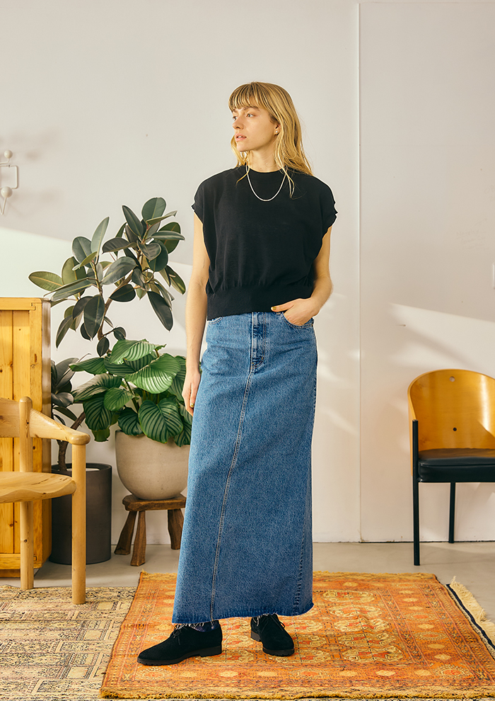 「シンプルなシルエットがきれいな“BUDDY デニムスカート”。腰高に見えるハイウエストと、あえて長めの着丈にすることで脚が長く、スタイルが良く見えるデザインに仕上げています。しっかりとしたデニム生地を使用し、シーズンレスで活躍するまさにBUDDY=相棒になるデニムスカートです」。