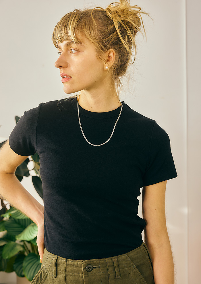 「2025年サマーコレクションで登場した“SPACE Tシャツ”を、今シーズンはボディカラーをブラックにして再登場。メンズライクな飛行機プリントを落とし込んだ、まるで古着のような雰囲気のTシャツです。風を通しやすいゆったりしたサイズ感は、夏でも涼しげな着用感」。