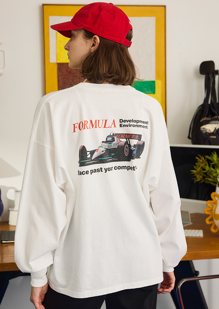 「ここからは「オブラダ」で毎シーズン人気のプリントTシャツシリーズをピックアップ。定番化しつつある車プリントシリーズを今シーズンはF1をイメージしたプリントでつくりました。90年台のファミコンソフトのパッケージのようなグラフィックが古着のようでお気に入り。ボディカラーはホワイトと、女性らしい雰囲気を添えるダスティピンクをご用意。季節の変わり目に一番使えるロンT、何枚あっても重宝するはず」。