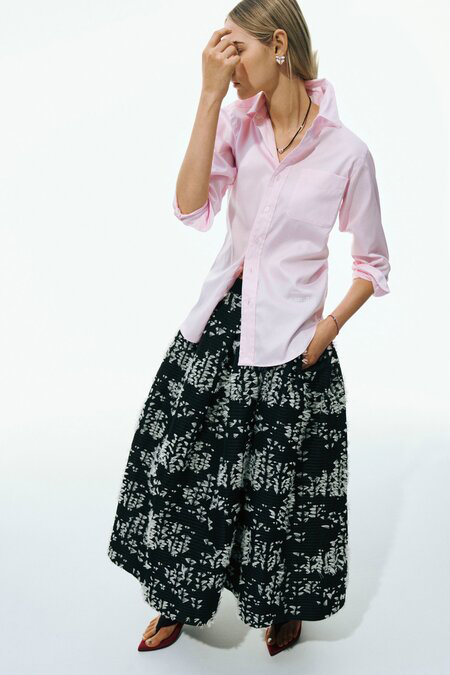 主役級のスカートには端正なシャツが最強の相棒。シャツブーム到来の今季は、オーセンティックなデザインのシャツを新調する価値あり! ボリューム感のあるスカートを合わせて、ドラマチックに着こなしたい。足元はトングサンダルで抜け感を。