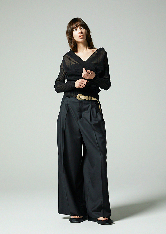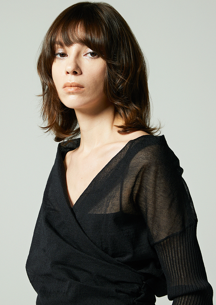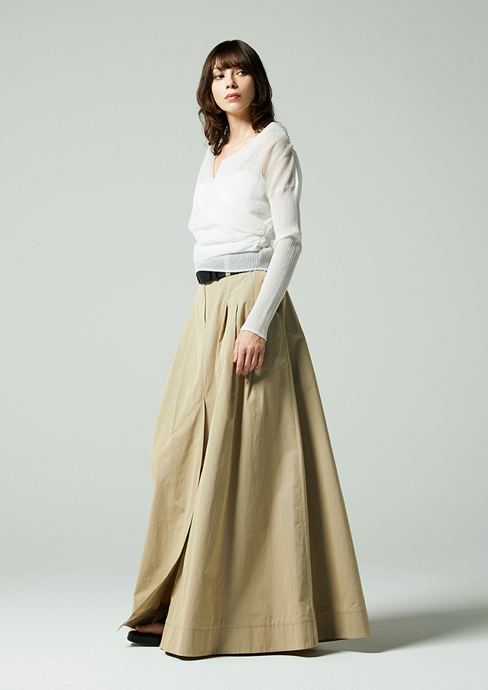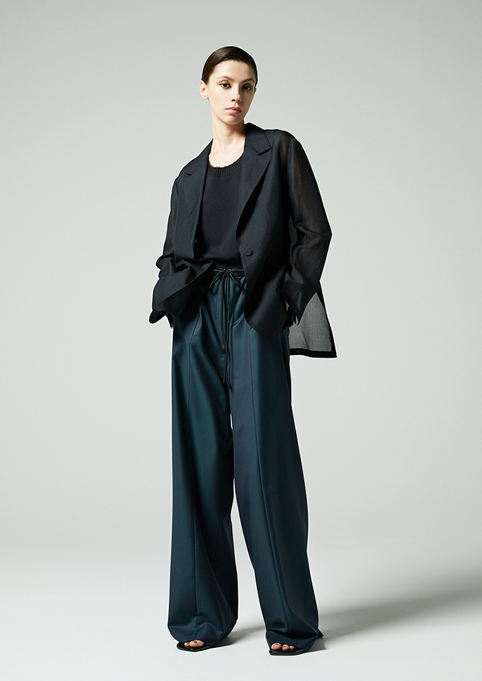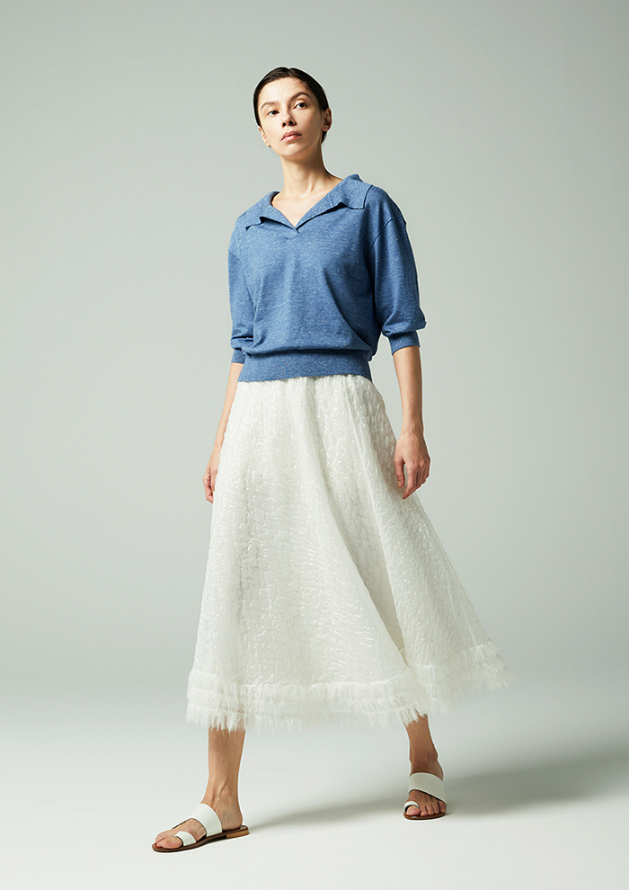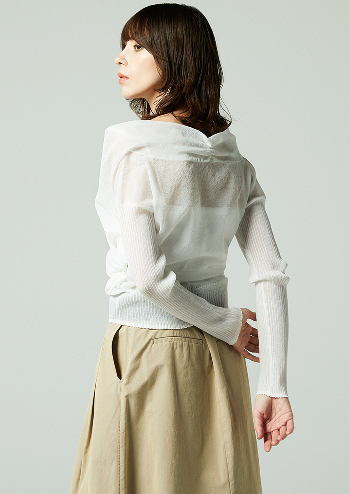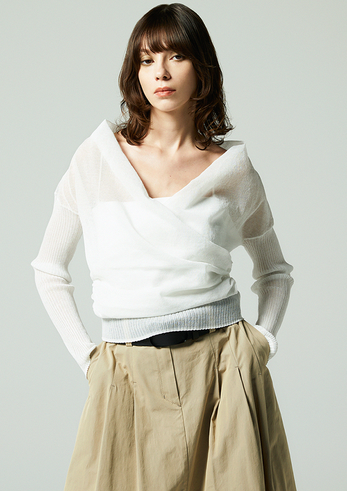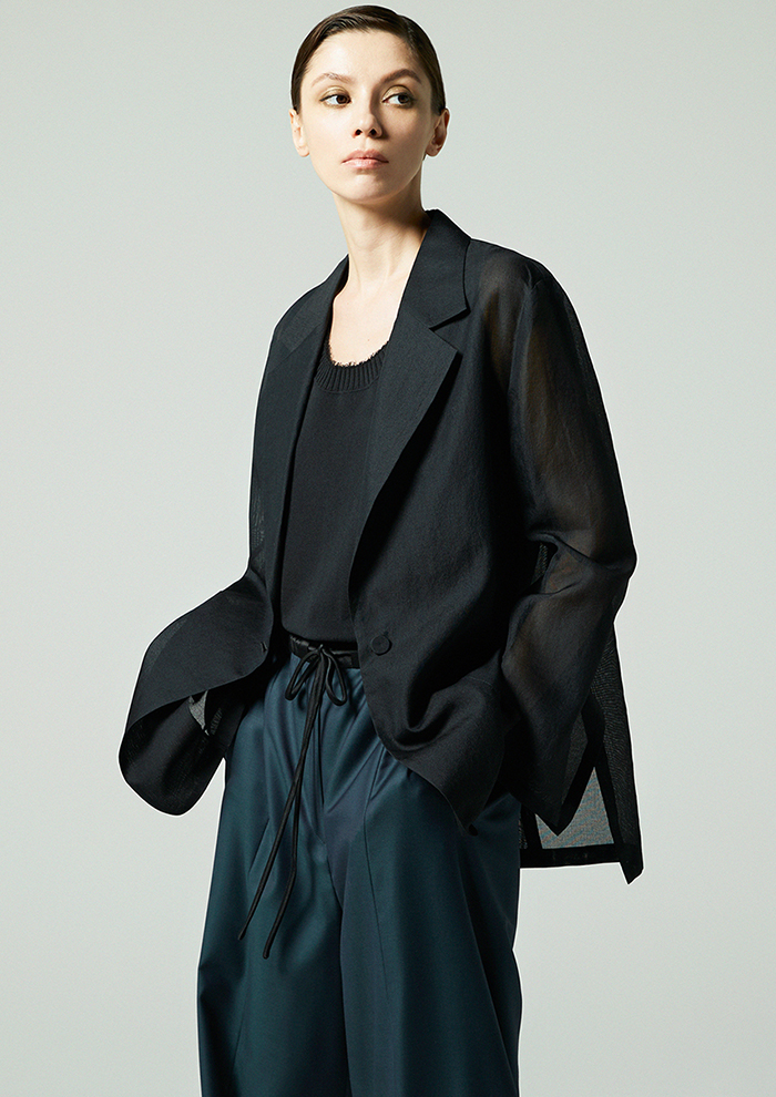 「麻とポリエステルを組み合わせた素材は、清涼感のあるタッチとほどよいハリが特徴。袖はリブでフィットさせることで、メリハリのあるシルエットに仕上げました。キャミソールを合わせるだけで、ほんのり透けるシアーな表情と立体感のあるフォルムがスタイリングをきめてくれます」。