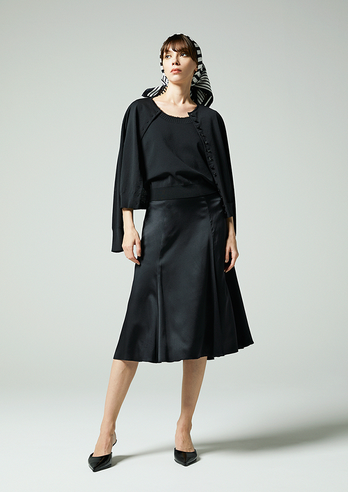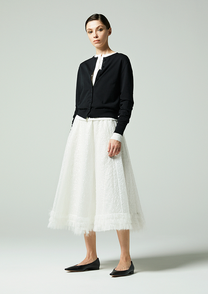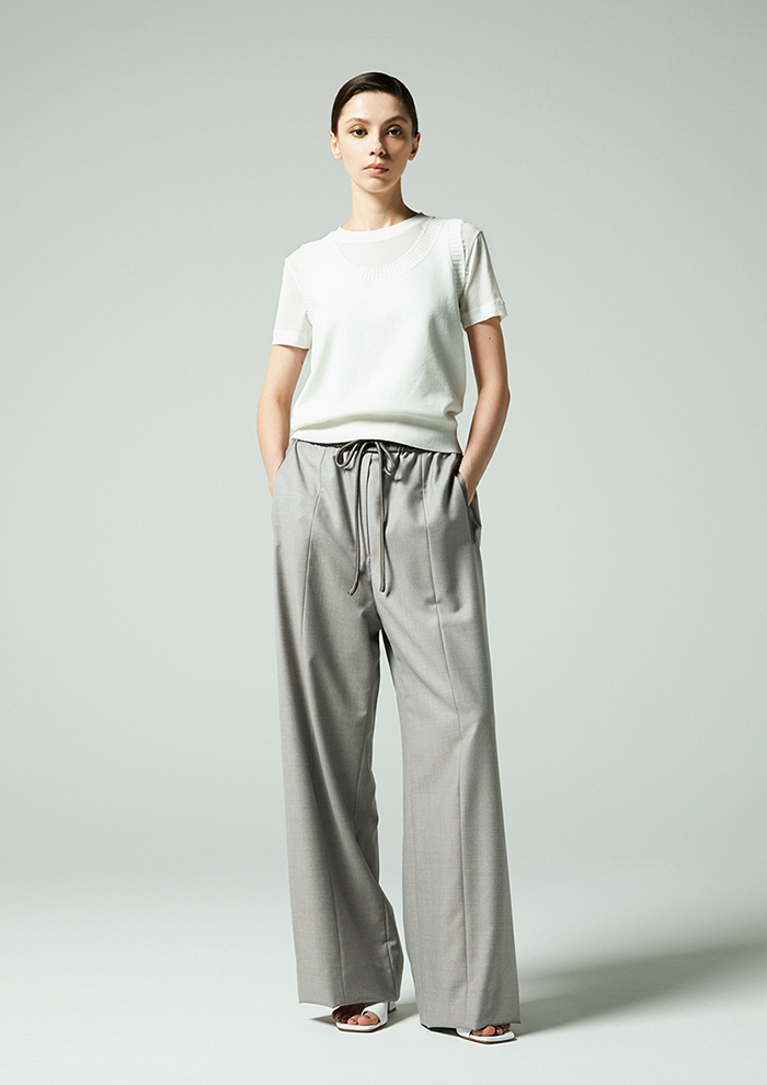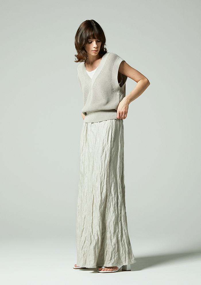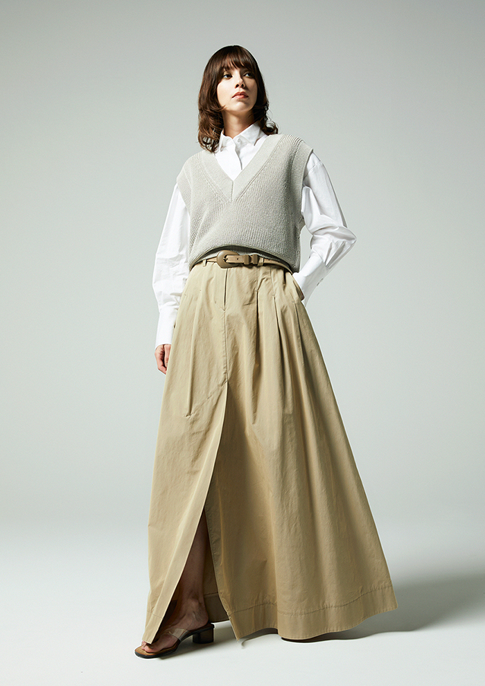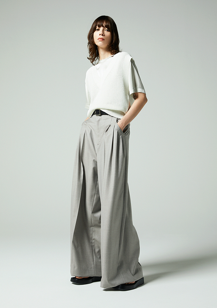 「ニットベストと同じ素材を使用しつつ、編み方を変えることですっきりとした軽やかな表情に。フロントに並ぶ同色ボタンはミニマルでありながら存在感があり、一枚でも着映えるバランスです」。