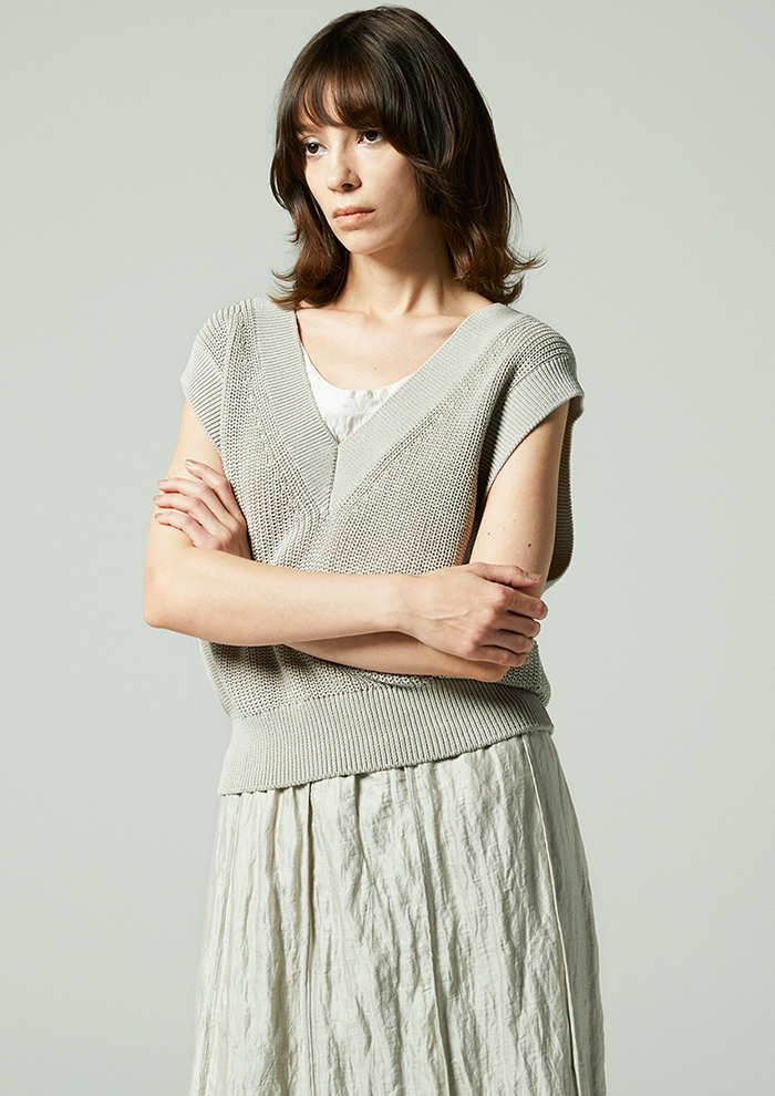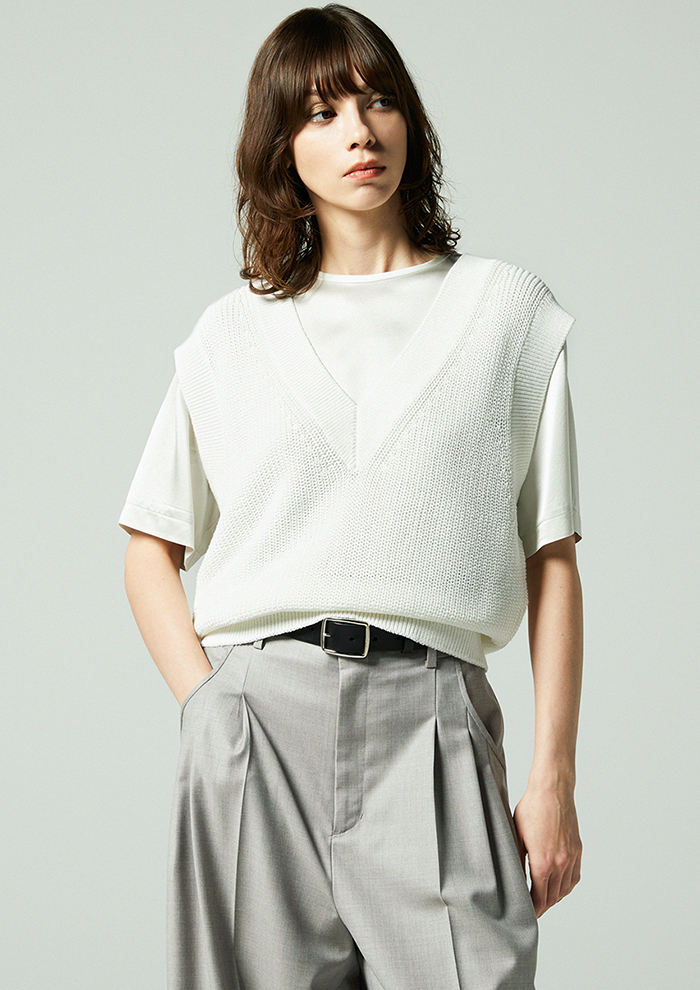 「レイヤードにも一枚着にも活躍する、着こなしの幅を広げるVネックベストもラインナップ。ほどよい厚みの畦編みで仕立てており、春はシャツやカットソーに重ねて、盛夏には一枚で軽やかに着られる汎用性の高さが魅力です」。
